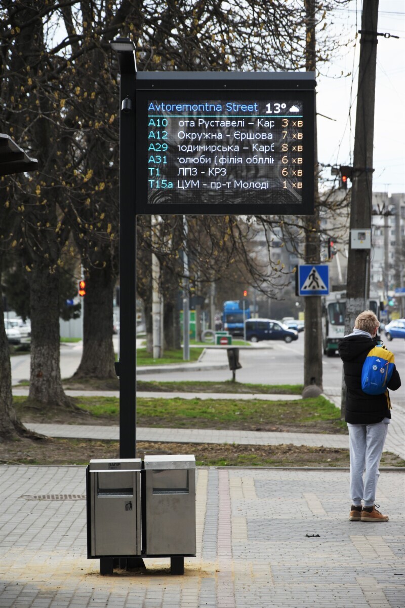 In total 22 public transport timetable "smart displays" have been installed in Lutsk. Each display is equipped with a charging point for cell phones, outdoor lighting, separate garbage bins, a video surveillance camera and Wi-Fi.