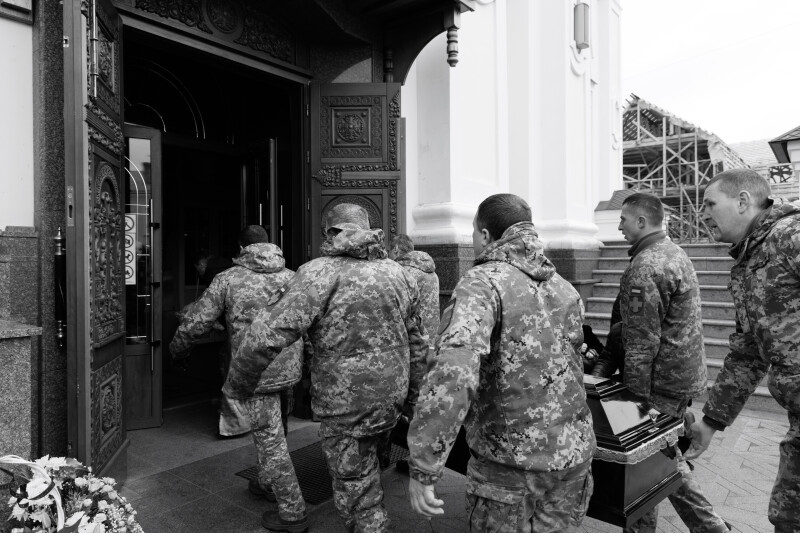Після завершення богослужіння домовину з тілом загиблого захисника пронесли Театральним Майданом. Біля пам’ятного фотостенду “Герої Небесної Сотні – Загинули за єдність України” траурна процесія зупинилася і виконала Державний Гімн.
