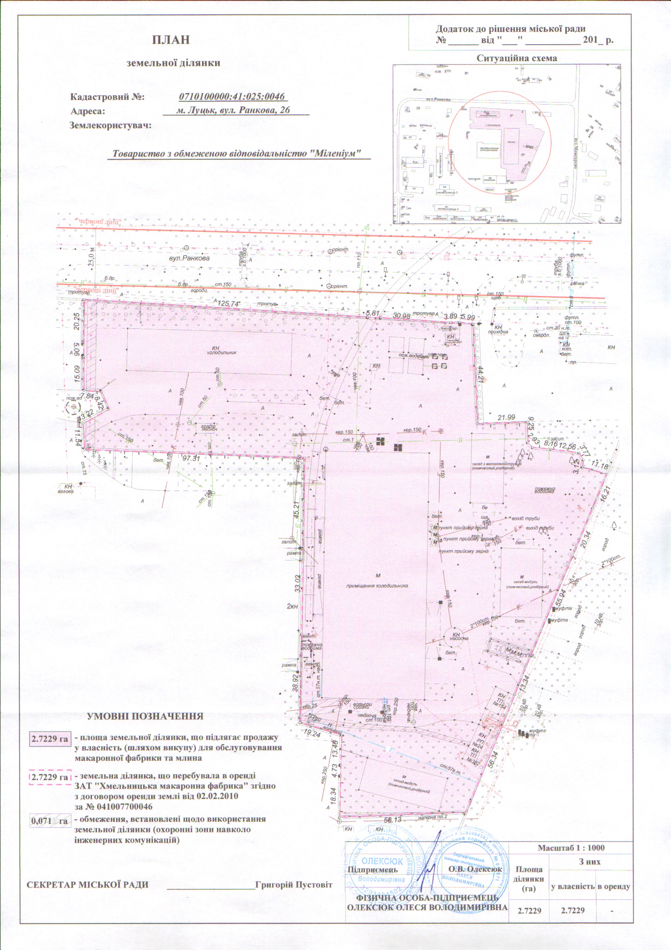 1. Продати у власність товариству з обмеженою відповідальністю “Міленіум” земельну ділянку несільськогосподарського призначення комунальної власності вул. Ранковій, 26, площею 2,7229 га, кадастровим номером 0710100000:41:025:0046, для обслуговування макаронної фабрики та млина, згідно з додатком.