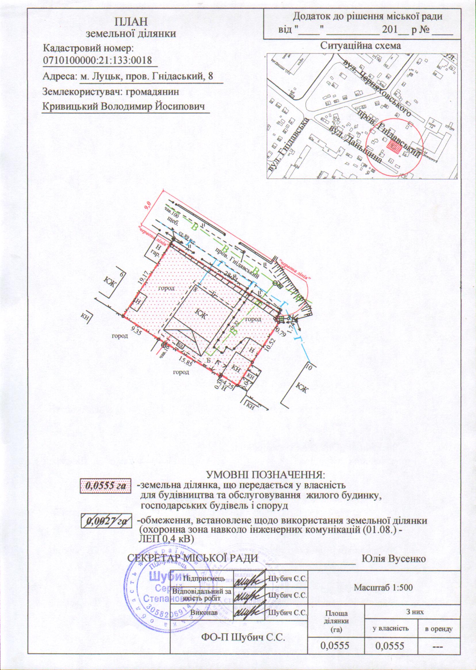 2. Передати громадянину Кривицькому Володимиру Йосиповичу безоплатно у власність земельну ділянку на пров. Гнідавському, 8 площею 0,0555 га, кадастровим номером 0710100000:21:133:0018 для будівництва та обслуговування жилого будинку, господарських будівель і споруд, згідно з додатком.