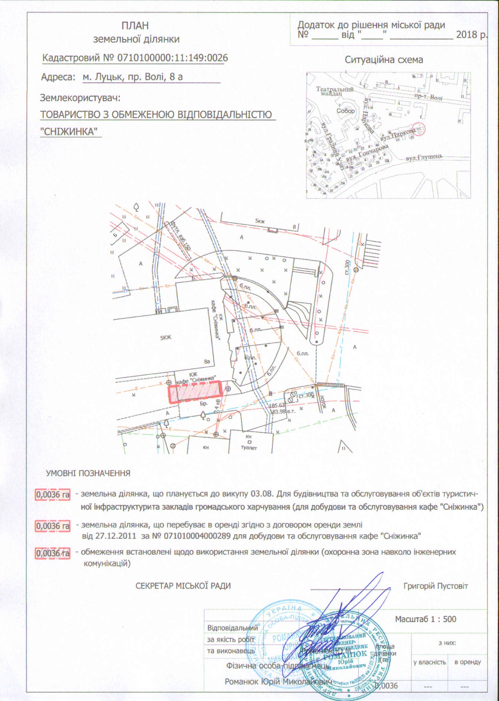 1. Надати товариству з обмеженою відповідальністю “Сніжинка” дозвіл на проведення експертної грошової оцінки земельної ділянки на проспекті Волі, 8а, площею 0,0036 га, кадастровим номером 0710100000:11:149:0026, цільовим призначенням: 03.08 для будівництва та обслуговування об’єктів туристичної інфраструктури та закладів громадського харчування (для добудови та обслуговування кафе “Сніжинка”), згідно з додатком.