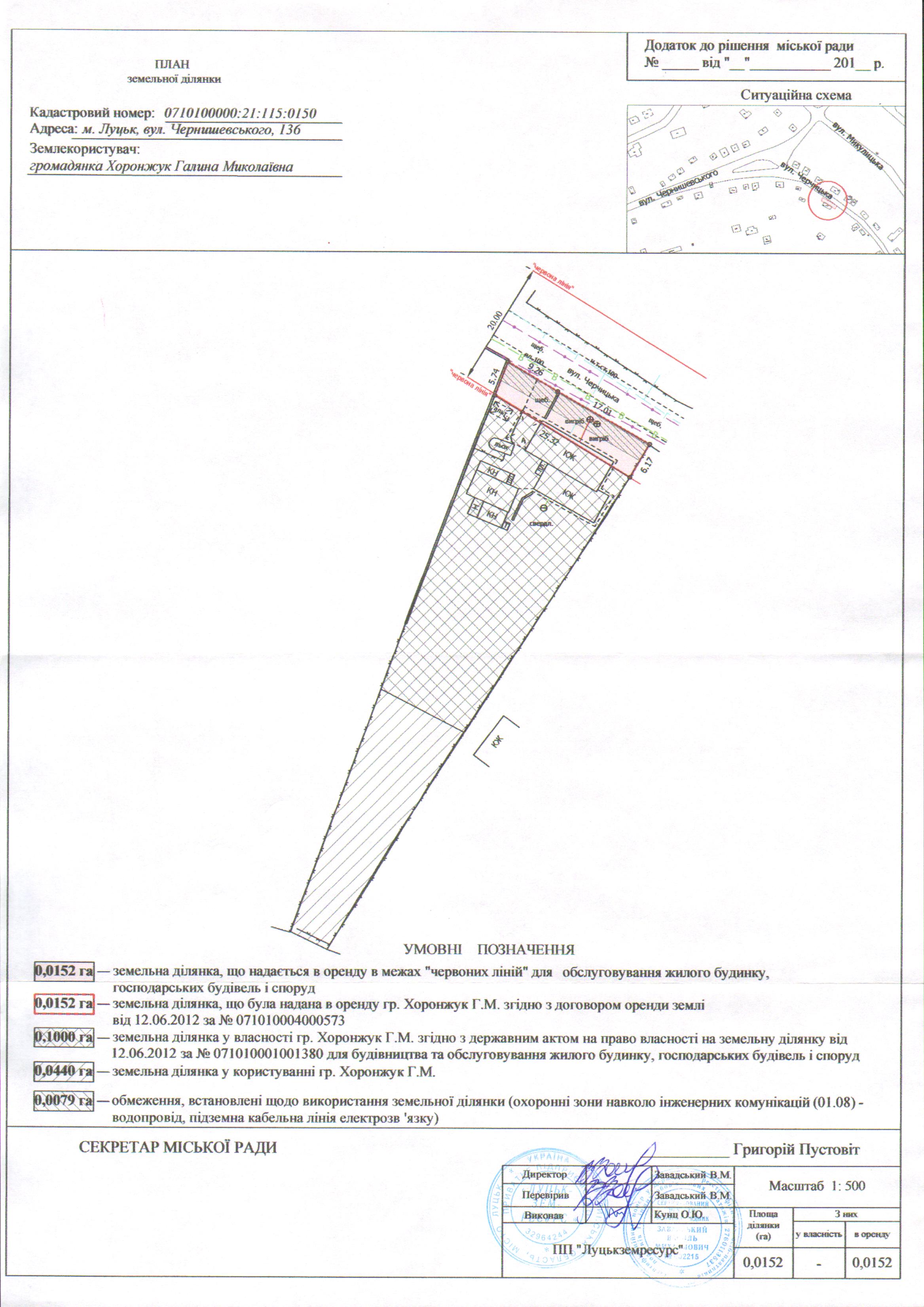 2. Надати громадянці Хоронжук Галині Миколаївні земельну ділянку на вул. Чернишевського, 136, на умовах оренди строком на 25 років з дати укладення договору оренди землі, площею 0,0152 га, кадастровим номером 0710100000:21:115:0150, в межах “червоних ліній” для обслуговування жилого будинку, господарських будівель і споруд, з земель комунальної власності, згідно з додатком.