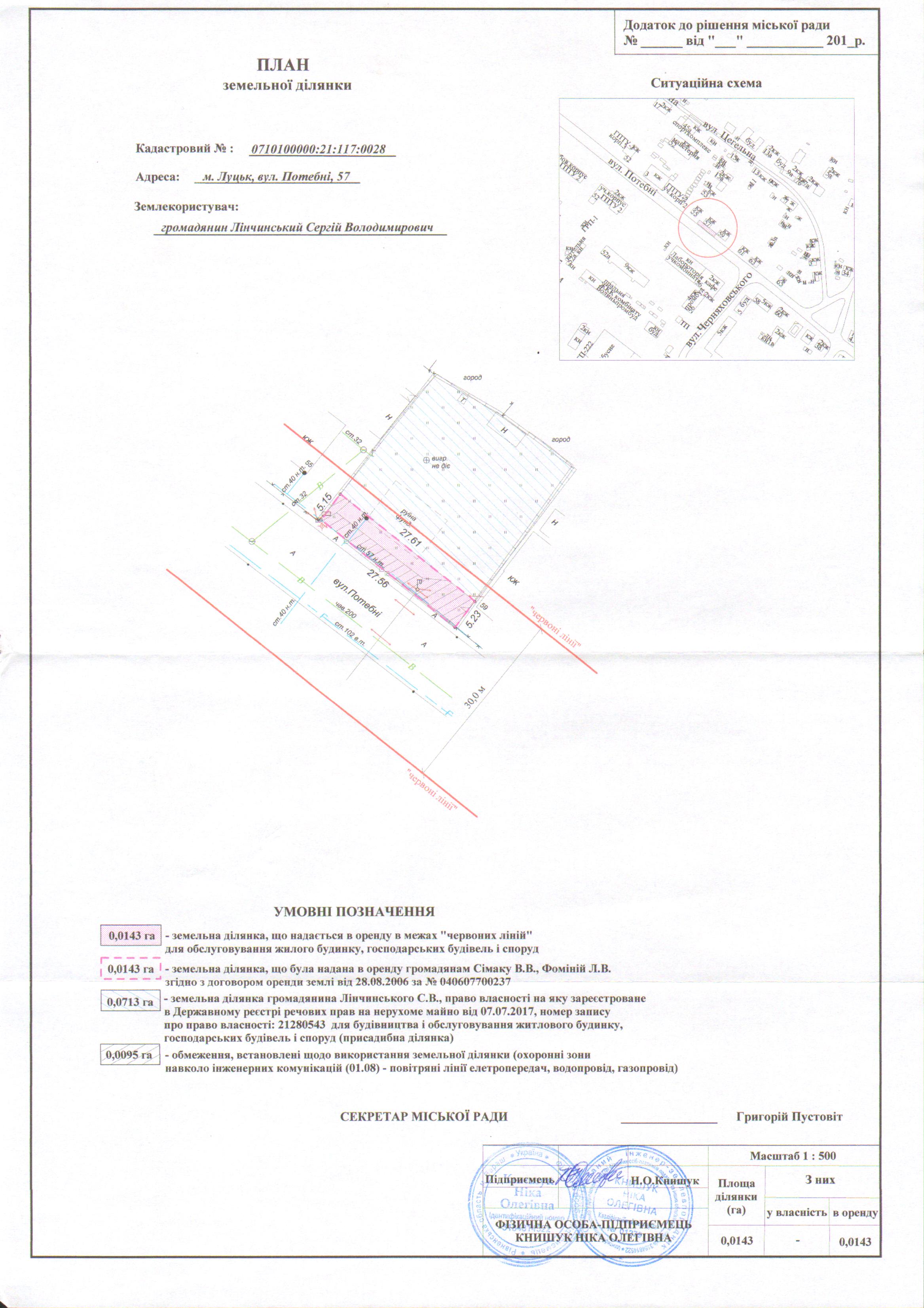 3. Укласти з громадянином Лінчинським Сергієм Володимировичем договір оренди земельної ділянки на вул. Потебні, 57 на вказаних в даному рішенні умовах, а також оформити інші документи, необхідні для вчинення цієї угоди.