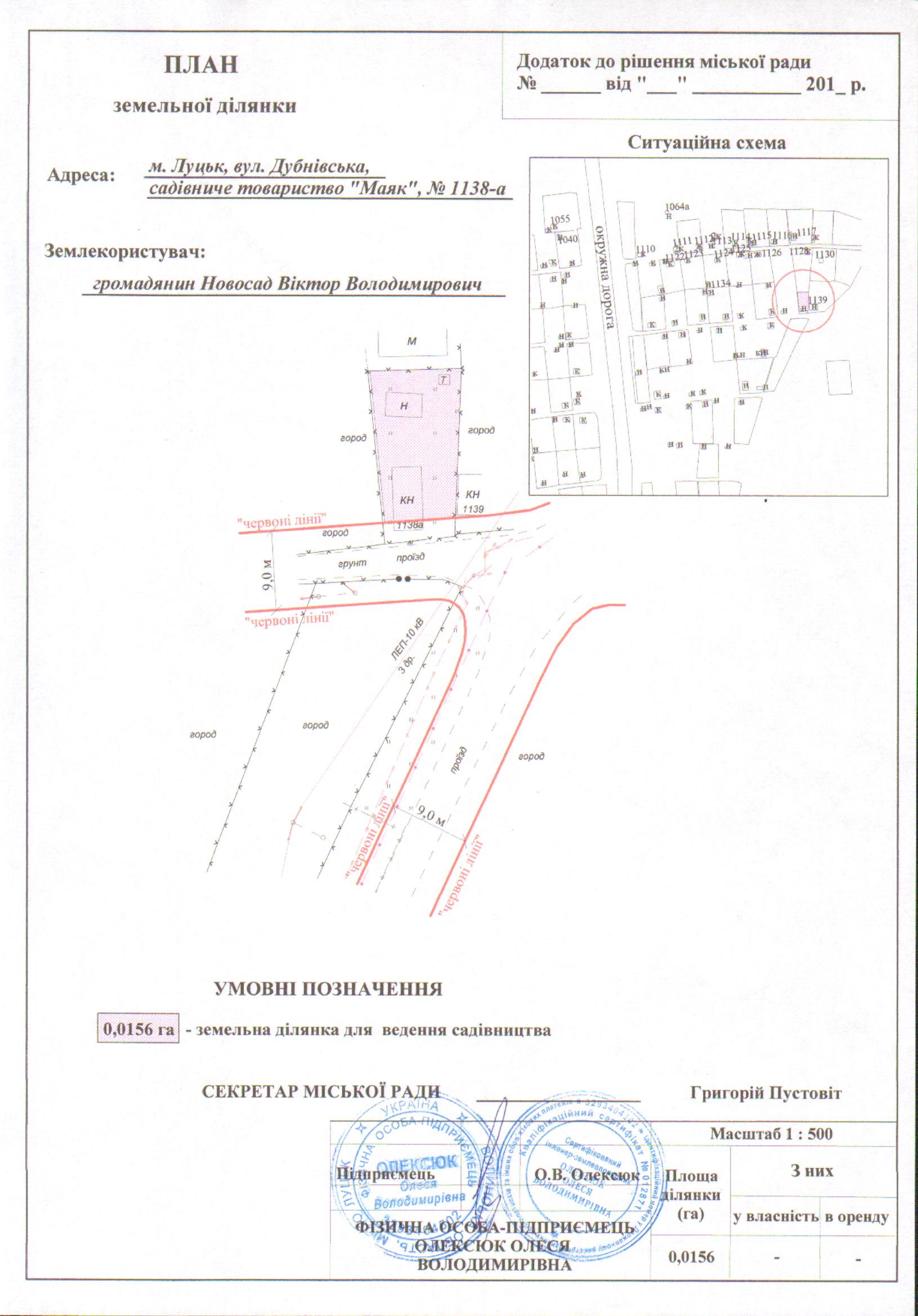 Розглянувши заяву громадянина Новосада Віктора Володимировича про надання дозволу на розроблення технічної документації із землеустрою щодо встановлення (відновлення) меж земельної ділянки в натурі (на місцевості) на вул. Дубнівській в садівничому товаристві «Маяк» №1138-а, довідку із садівничого товариства «Маяк», керуючись статтями 12, 96, 116, 118, 120, 121 Земельного кодексу України, Законом України «Про внесення змін до деяких законодавчих актів України щодо розмежування земель державної та комунальної власності», Законом України «Про землеустрій», Законом України «Про Державний земельний кадастр», Постановою Кабінету Міністрів України від 17.10.2012р. №1051 «Про затвердження Порядку ведення Державного земельного кадастру», ст. 26 Закону України «Про місцеве самоврядування в Україні» Генеральним планом міста Луцька, затвердженим рішенням міської ради від 24.06.2009 №42/1 «Про затвердження Генерального плану міста», планом зонування міста Луцька, затвердженим рішенням міської ради від 31.03.2015 №71/13 «Про затвердження плану зонування території міста Луцька», міська рада