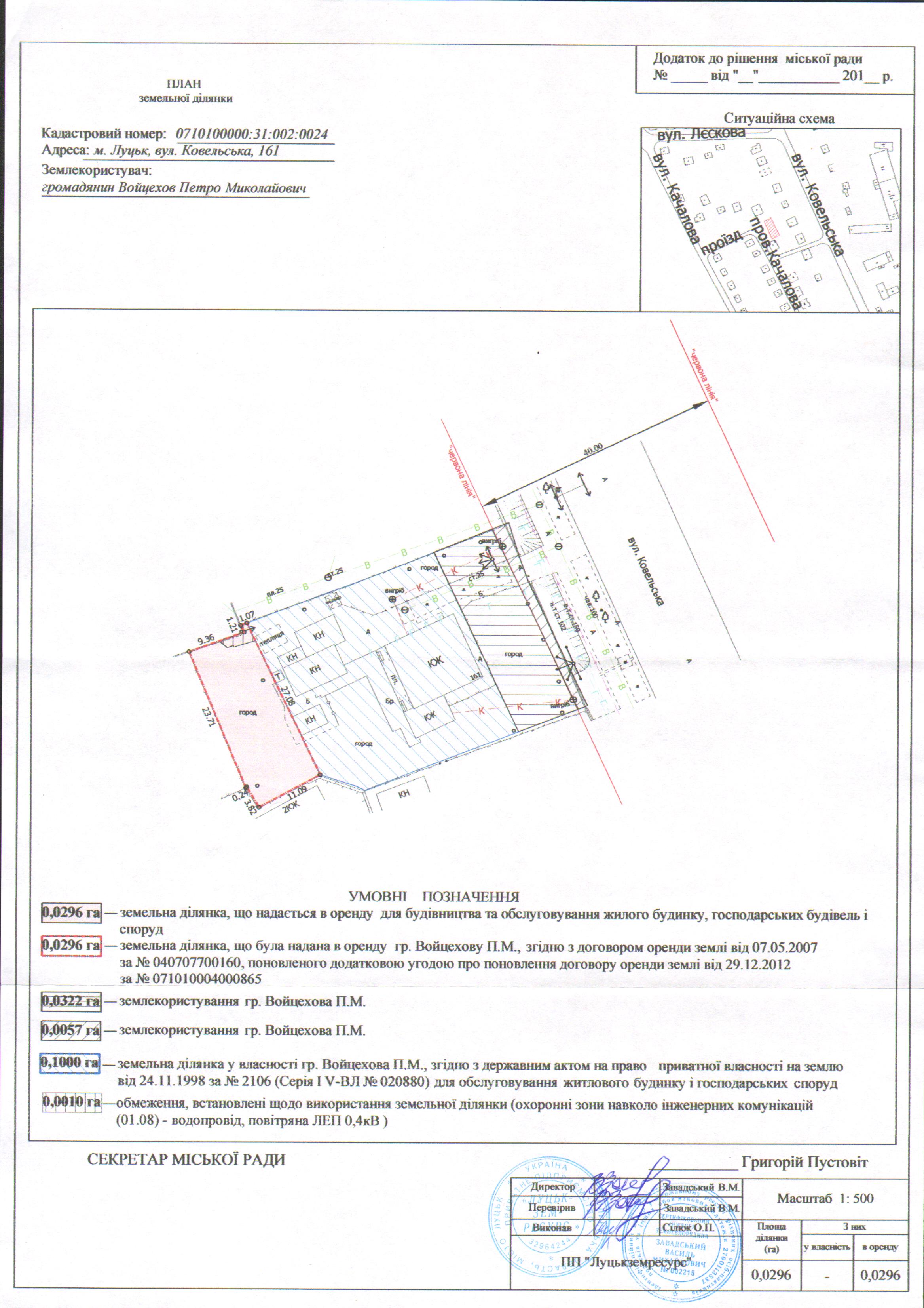 2. Надати громадянину Войцехову Петру Миколайовичу земельну ділянку на вул. Ковельській, 161, на умовах оренди строком на 25 років з дати укладення договору оренди землі, площею 0,0296 га, кадастровим номером 0710100000:31:002:0024, для будівництва та обслуговування жилого будинку, господарських будівель і споруд, з земель комунальної власності, згідно з додатком.