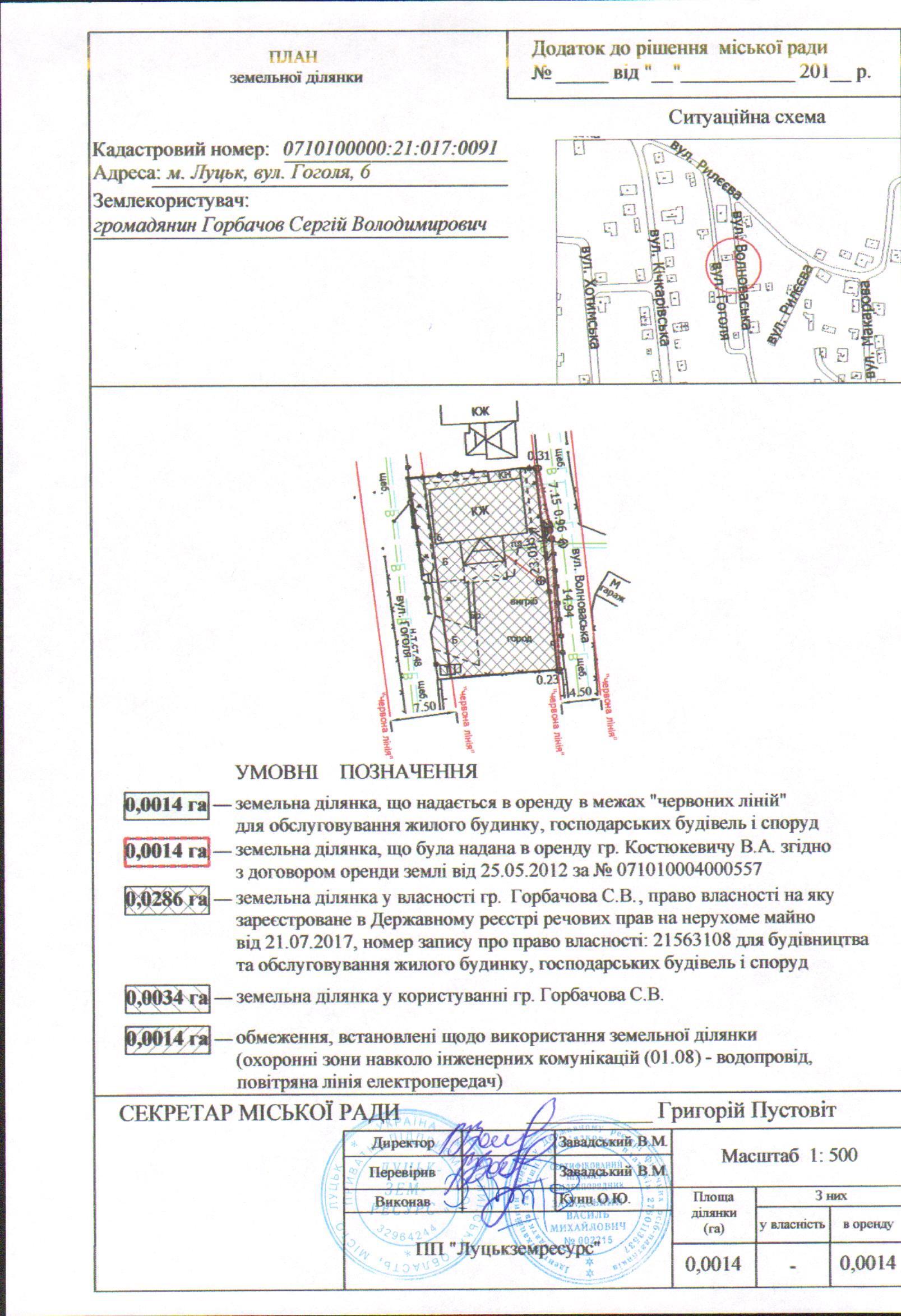 1. Затвердити громадянину Горбачову Сергію Володимировичу технічну документацію із землеустрою щодо встановлення (відновлення) меж земельної ділянки в натурі (на місцевості) на вул. Гоголя, 6, площею 0,0014 га, кадастровим номером 0710100000:21:017:0091, в межах “червоних ліній” для обслуговування жилого будинку, господарських будівель і споруд.