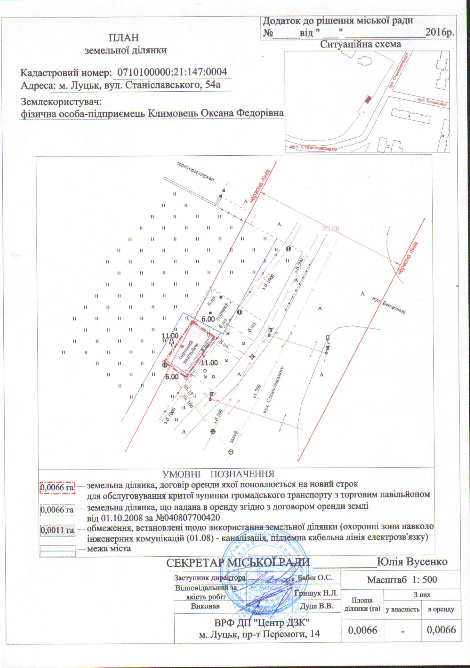 1. Продовжити фізичній особі-підприємцю Климовець Оксані Федорівні термін оренди земельної ділянки на вул. Станіславського, 54а строком на 5 років з дати закінчення договору оренди землі (до 01.10.2018), площею 0,0066 га, кадастровим номером 0710100000:21:147:0004, для обслуговування критої зупинки громадського транспорту з торговим павільйоном, згідно з додатком.
