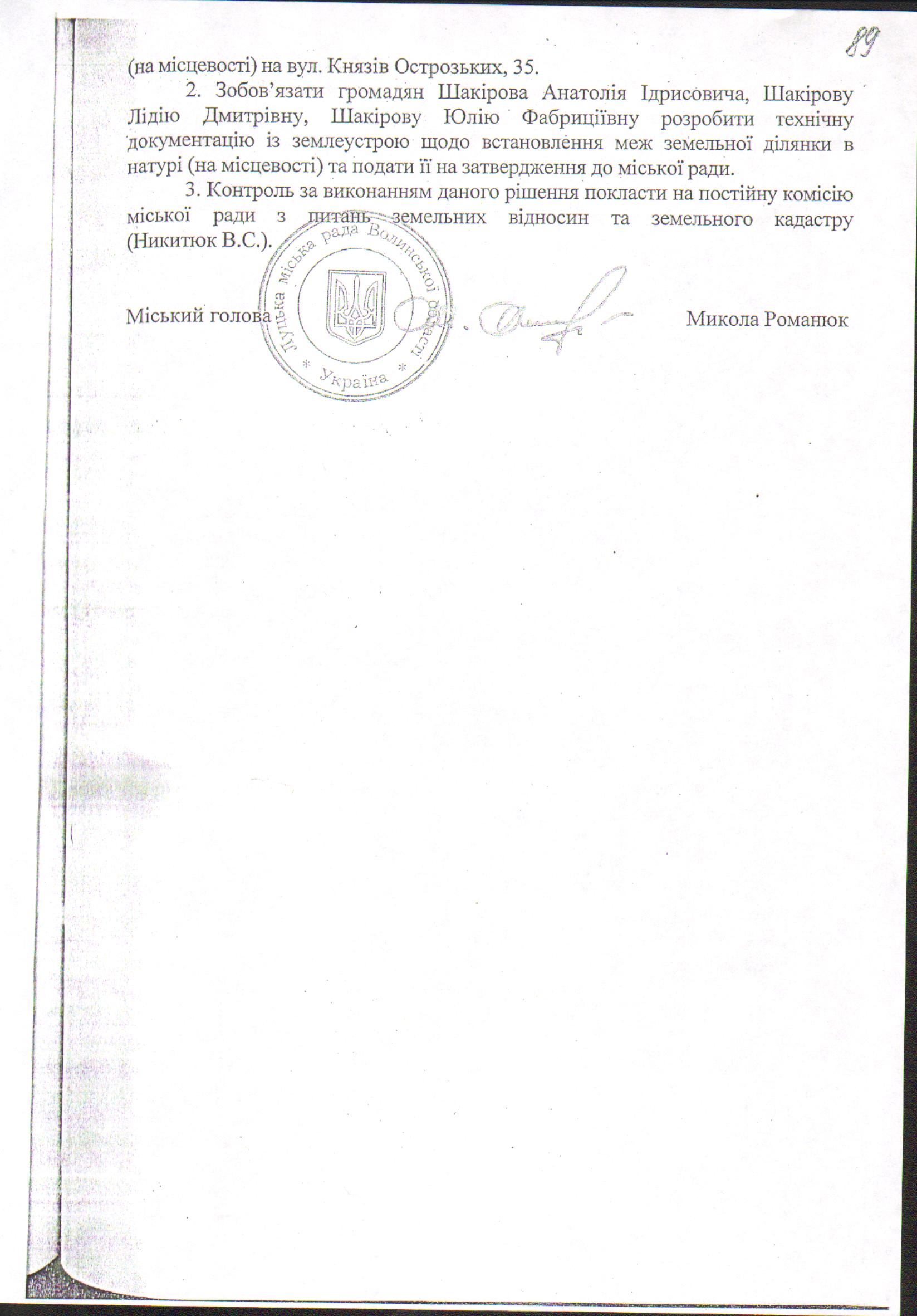 2. Зобов’язати громадян Шакірову Лідію Дмитрівну, Шакірову Юлію Фабриціївну розробити технічну документацію із землеустрою щодо встановлення (відновлення) меж земельної ділянки в натурі (на місцевості) та подати її на затвердження до міської ради.