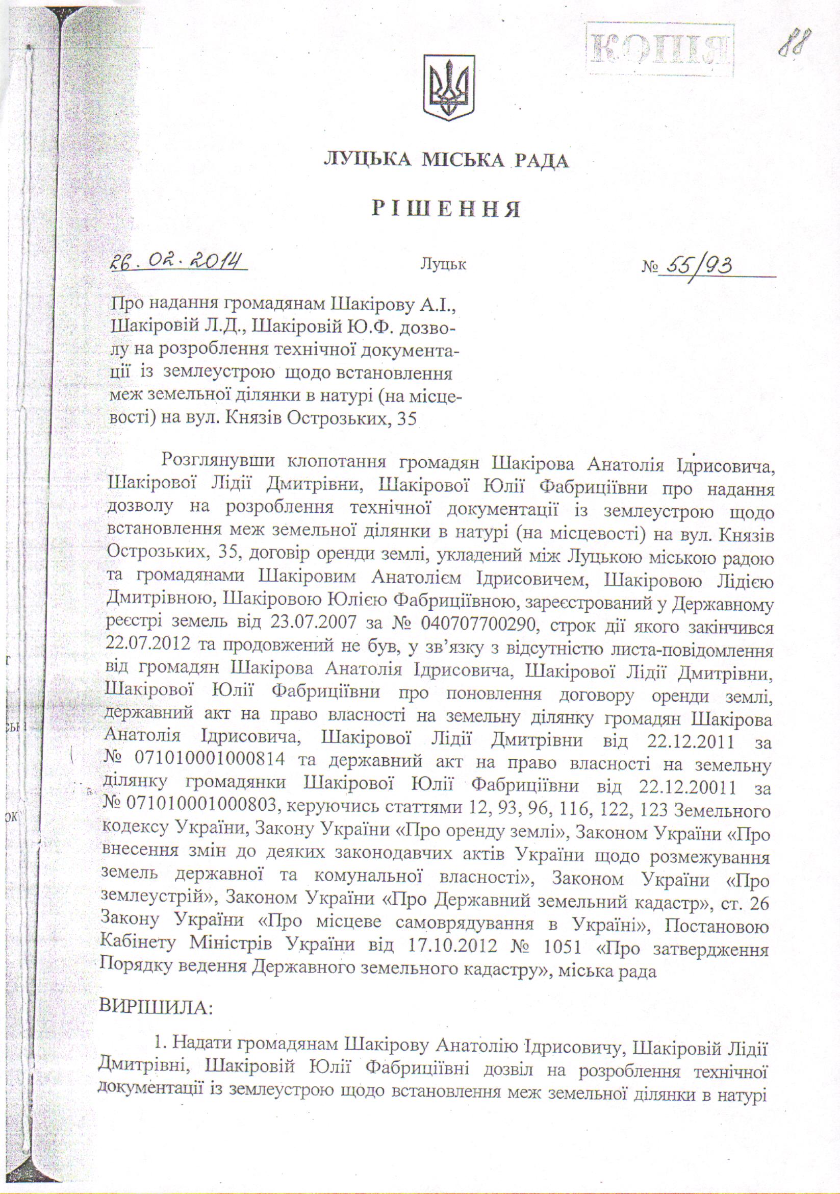 Розглянувши клопотання громадян Шакірової Лідії Дмитрівни, Шакірової Юлії Фабриціївни про внесення змін в рішення Луцької міської ради від від 26.02.2014 № 55/93 «Про надання громадянам Шакірову А.І., Шакіровій Л.Д., Шакіровій Ю.Ф. дозволу на розроблення технічної документації із землеустрою щодо встановлення меж земельної ділянки в натурі (на місцевості) на вул. Князів Острозьких, 35» у зв’язку із набуттям права власності на частину нерухомого майна на вул. Князів Острозьких, 35, яка належала громадянинку Шакірову Анатолію Ідрисовичу, громадянкою Шакіровою Лідією Дмитрівною (свідоцтво про право на спадщину за законом від 18.05.2017 за № 403, відповідно до якого право власності на 1/100 частки житлового будинку з надвірними будівлями та спорудами зареєстроване у Державному реєстрі речових прав на нерухоме майно 18.05.2017, номер запису про право власності: 20459452, технічний паспорт на садибний (індивідуальний) житловий будинок від 11.01.2018; свідоцтво про право на спадщину за законом від 18.05.2017 за № 404, державний акт на право власності на земельну ділянку від 22.12.2011 за № 071010001000814, відповідно до яких право власності на земельну ділянку площею 0,0573 га зареєстроване у Державному реєстрі речових прав на нерухоме майно 18.05.2017, номер запису про право власності: 20459601), керуючись статтями 12, 120, 122, 123, 186 Земельного кодексу України, статтею 7 Закону України «Про оренду землі», Законом України «Про внесення змін до деяких законодавчих актів України щодо розмежування земель державної та комунальної власності», статтею 25 Закону України «Про землеустрій», статтею 26 Закону України «Про місцеве самоврядування в Україні», рішенням Луцької міської ради від 26.11.2015 № 112 «Про затвердження персонального складу постійних комісій Луцької міської ради», міська рада