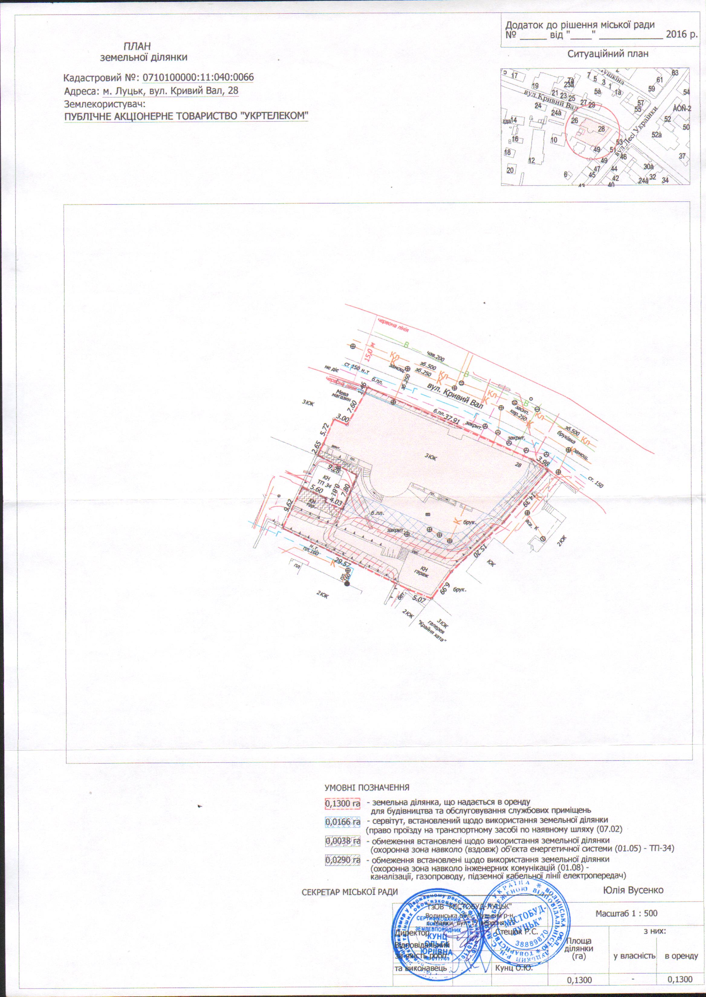 2. Надати ПУБЛІЧНОМУ АКЦІОНЕРНОМУ ТОВАРИСТВУ «УКРТЕЛЕКОМ» земельну ділянку на вул. Кривий Вал, 28 на умовах оренди строком на 10 років, площею 0,1300 га, кадастровим номером 0710100000:11:040:0066, для будівництва та обслуговування службових приміщень, згідно з додатком.