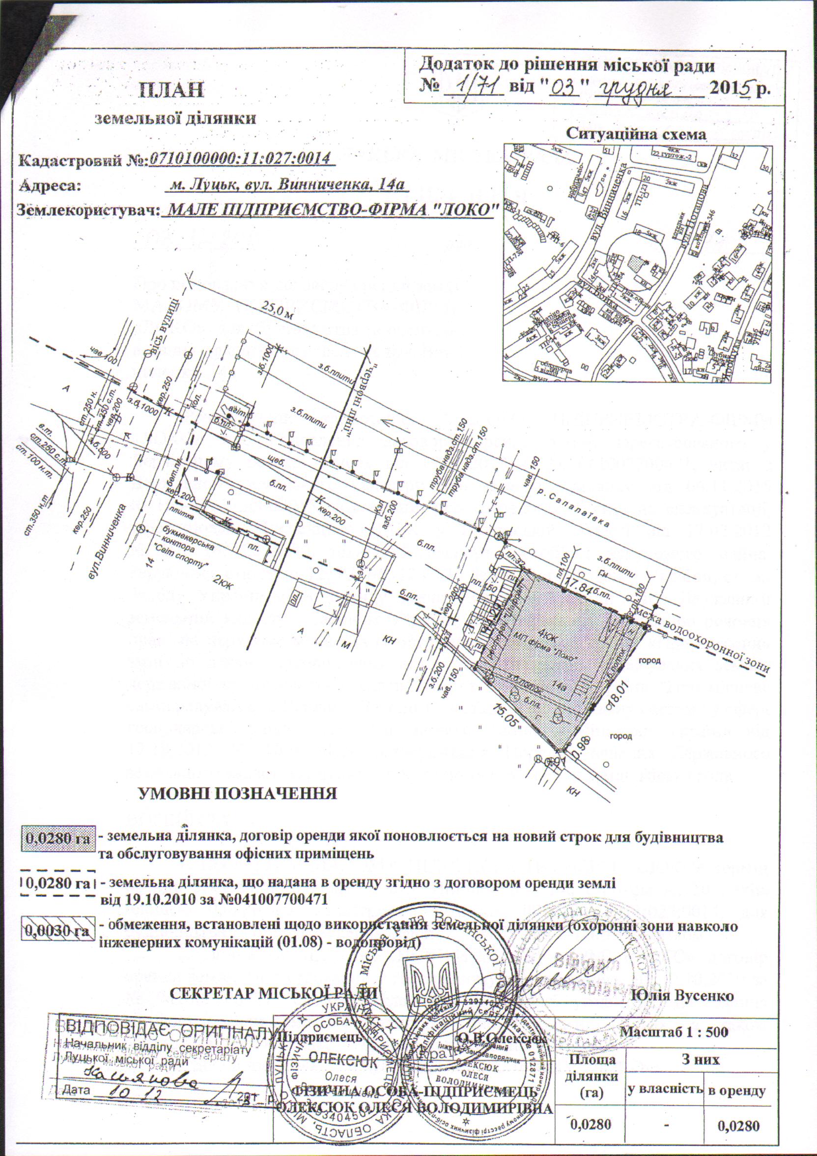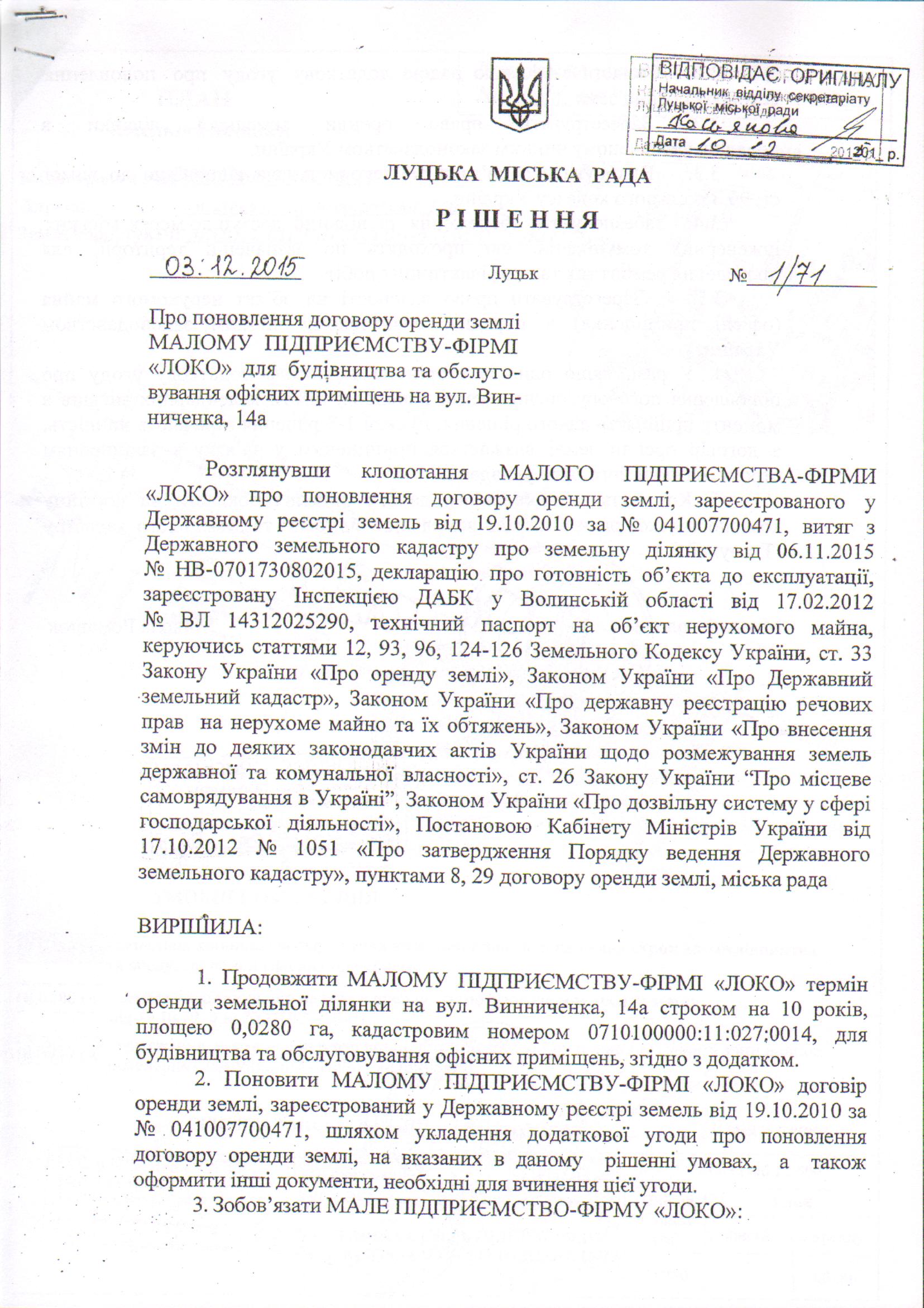 Розглянувши клопотання МАЛОГО ПІДПРИЄМСТВА-ФІРМИ «ЛОКО» щодо внесення змін до рішення Луцької міської ради від 03.12.2015 № 1/71 «Про поновлення договору оренди землі МАЛОМУ ПІДПРИЄМСТВУ-ФІРМІ «ЛОКО» для будівництва та обслуговування офісних приміщень на вул. Винниченка, 14а», договір оренди землі, зареєстрований у Державному реєстрі земель від 19.11.2010 за № 041007700471, додаткову угоду про поновлення договору оренди землі, зареєстрованого у Державному реєстрі земель від 19.11.2010 за № 041007700471, від 16.05.2016, у зв`язку із допущенням технічної помилки, керуючись ст. 12 Земельного кодексу України та ст. 26 Закону України «Про місцеве самоврядування в Україні», міська рада