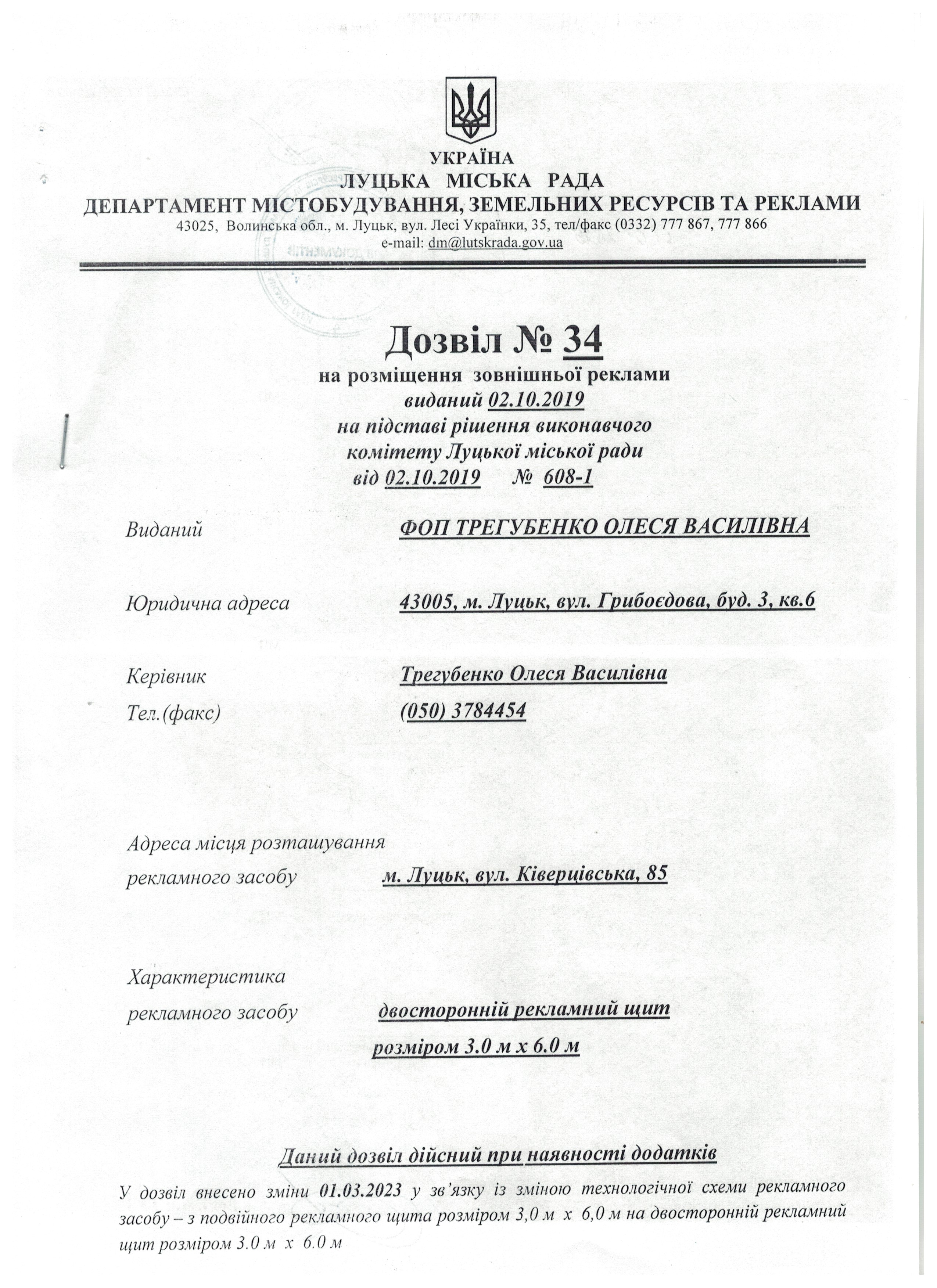 Дозвіл на розміщення зовіншньої реклами від 02.10.2019 № 34, виданий ФОП Трегубенко Олесі Василівні на вул. Ківерцівській, 85