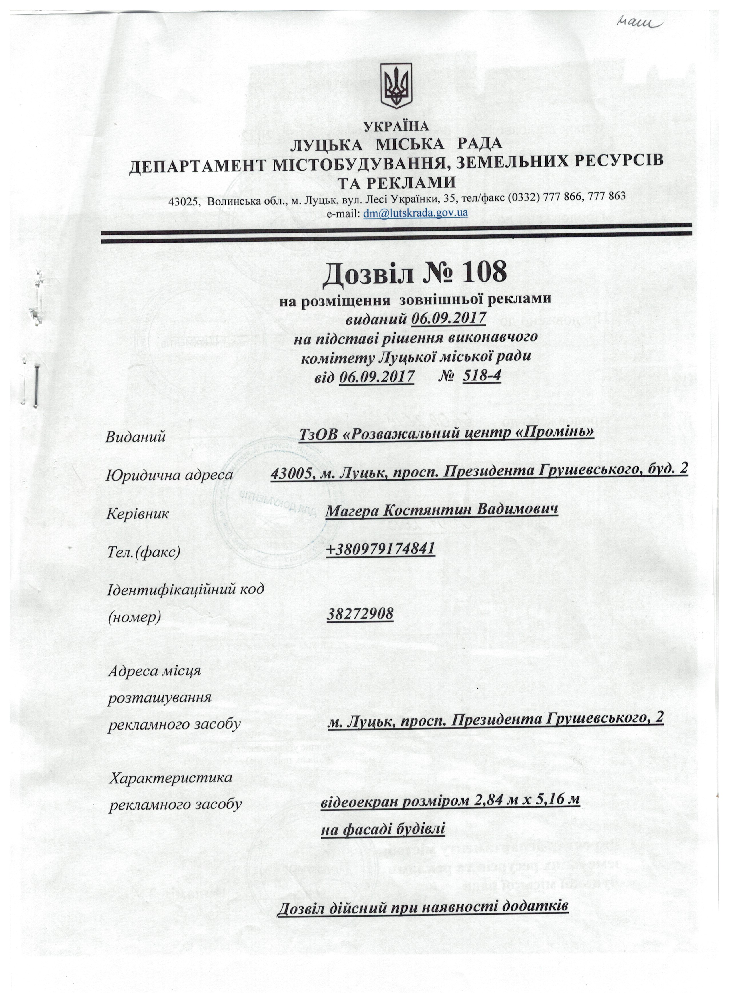Дозвіл на розміщення зовнішньої реклами від 06.09.2017 № 108, виданий ТзОВ "Розважальний центр "Промінь" на просп. Президента Грушевського, 2
