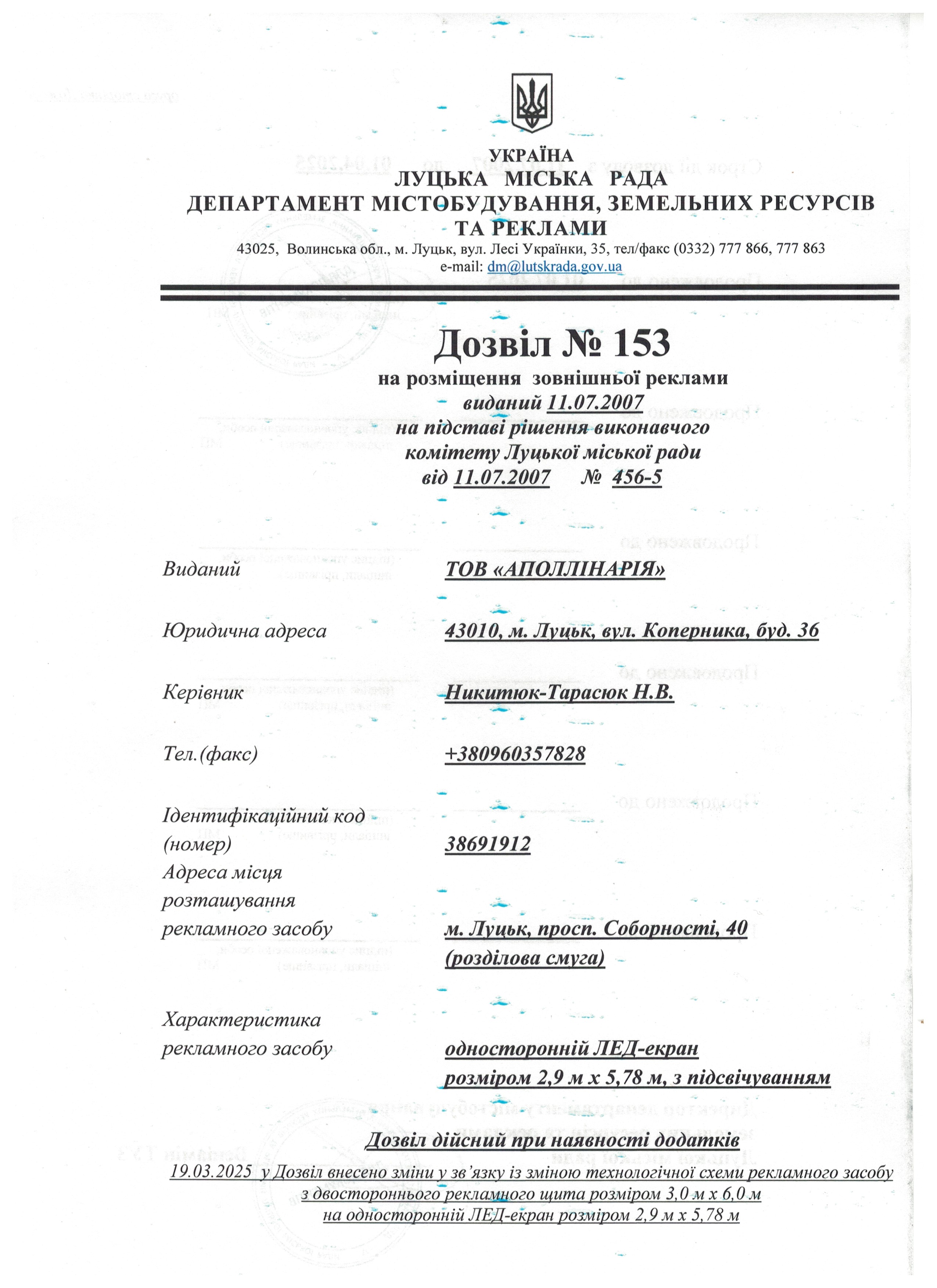 Дозвіл на розміщення зовнішньої реклами від 11.07.2007 № 153, виданий ТОВ "АПОЛЛІНАРІЯ" на просп. Соборності, 40