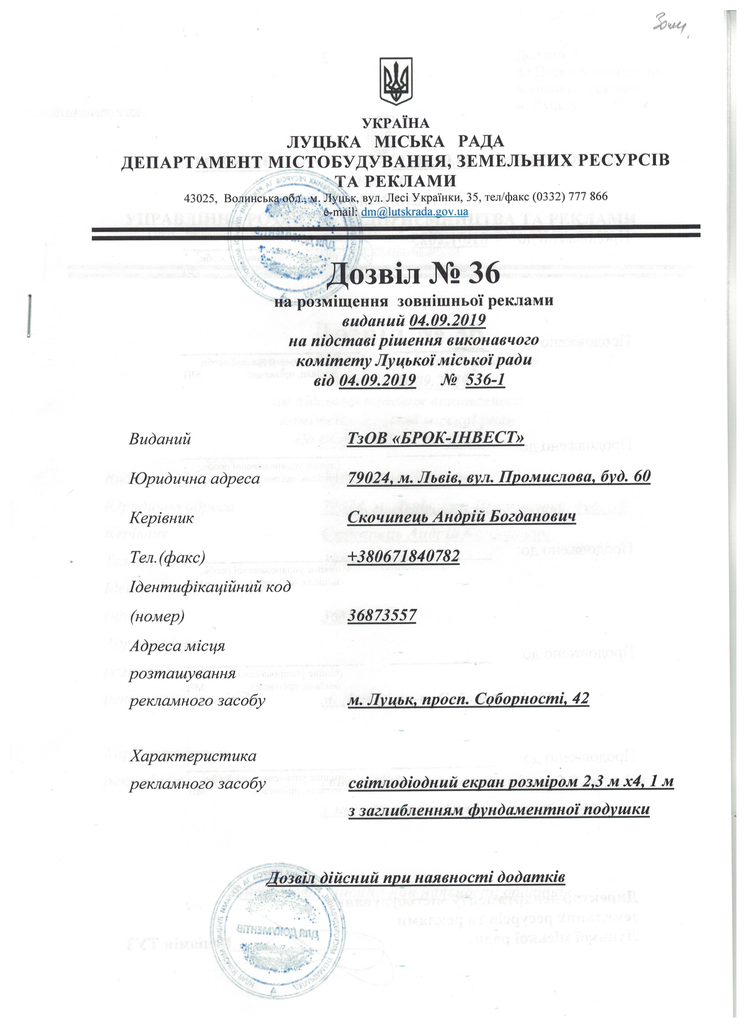 Дозвіл на розміщення ЗР від 04.09.2019 № 36, виданий ТзОВ "Брок-Інвест" на пр-ті Соборності, 42