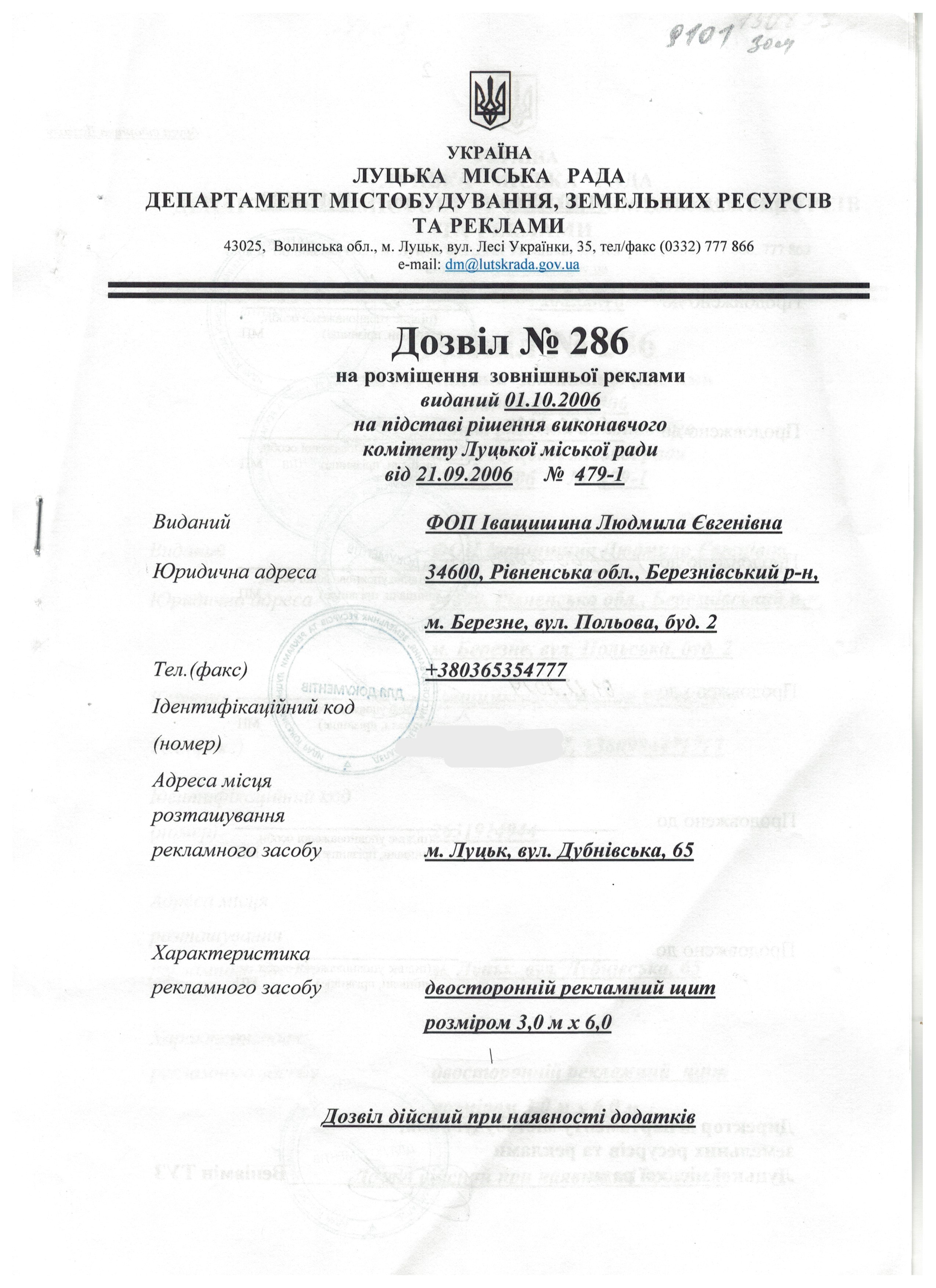 Дозвіл від 01.10.2006 № 286 на розміщення зовнішньої реклами, виданий ФОП Іващишиній Людмилі Євгенівні (двосторонній рекламний щит 3,0 м х 6,0 м на вул. Дубнівській, 65)