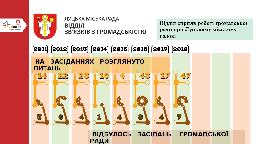 З метою координації заходів, пов'язаних із забезпеченням проведення консультацій з громадськістю з питань формування та реалізації державної політики та вирішення проблем міста працює громадська рада при Луцькому міському голові. Протягом 2018 року було організовано 7 засідань громадської ради на яких розглянуто 47 питань. 16 серпня, відповідно до положення про роботу громадської ради при Луцькому міському голові, відбулось оновлення складу громадської ради. За результатами відкритого голосування до складу громадської ради увійшли 13 представників інститутів громадянського суспільства. У 2018 році проведено 4 засідання нового складу громадської ради.