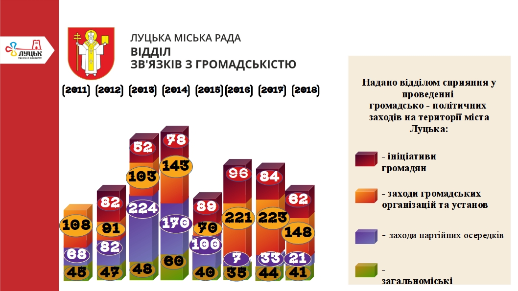 В Луцькій міській раді налагоджено доброзичливий та конструктивний діалог з об’єднаннями громадян. Свідченням цього є сприяння проведенню у Луцьку протягом року 272 масових заходів, ініційованих організаціями та мешканцями громади й відсутність підстав щодо обмеження прав на проведення цих заходів на території міста Луцька.