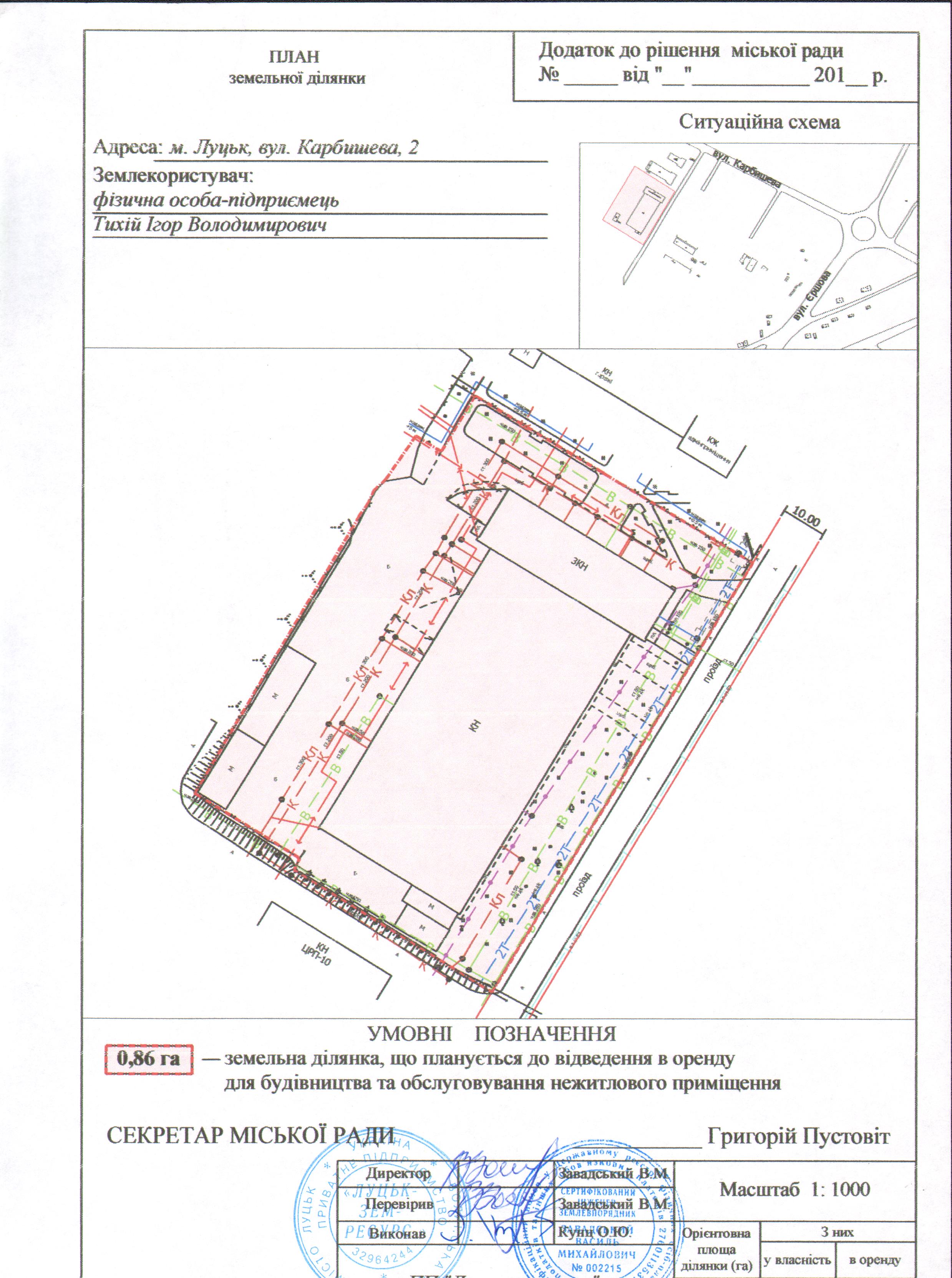 Розглянувши клопотання фізичної особи-підприємця Тихія Ігоря Володимировича про надання дозволу на розроблення проекту землеустрою щодо відведення земельної ділянки в оренду на вул. Карбишева, 2 для будівництва та обслуговування нежитлового приміщення, схему генплану земельної ділянки з прикладеним листом управління містобудування та архітектури Луцької міської ради щодо режиму забудови даної території, визначеної для містобудівних потреб, встановлених у генеральному плані міста Луцька, правовстановлюючі документи фізичної особи-підприємця Тихія Ігоря Володимировича на об’єкт нерухомого майна на вул. Карбишева, 2: договір купівлі-продажу від 24.09.2004 № 2307, відповідно до якого право власності на будівлю центральних ремонтних майстерень зареєстроване 28.09.2004, реєстраційний номер: 2689872, технічний паспорт на об’єкт нерухомого майна від 25.09.2004, керуючись статтями 12, 79-1, 93, 123 Земельного кодексу України, статтею 6 Закону України «Про оренду землі», статтею 50 Закону України «Про землеустрій», Законом України «Про регулювання містобудівної діяльності», Законом України «Про внесення змін до деяких законодавчих актів України щодо розмежування земель державної та комунальної власності», статтею 26 Закону України «Про місцеве самоврядування в Україні», міська рада