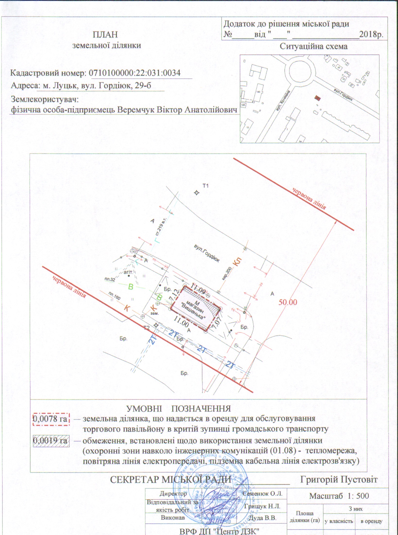 1. Затвердити фізичній особі-підприємцю Веремчуку Віктору Анатолійовичу проект землеустрою щодо відведення земельної ділянки на вул. Гордіюк, 29-б площею 0,0078 га, кадастровим номером 0710100000:22:031:0034, для обслуговування торгового павільйону в критій зупинці громадського транспорту (В 03.07 - для будівництва та обслуговування будівель торгівлі).