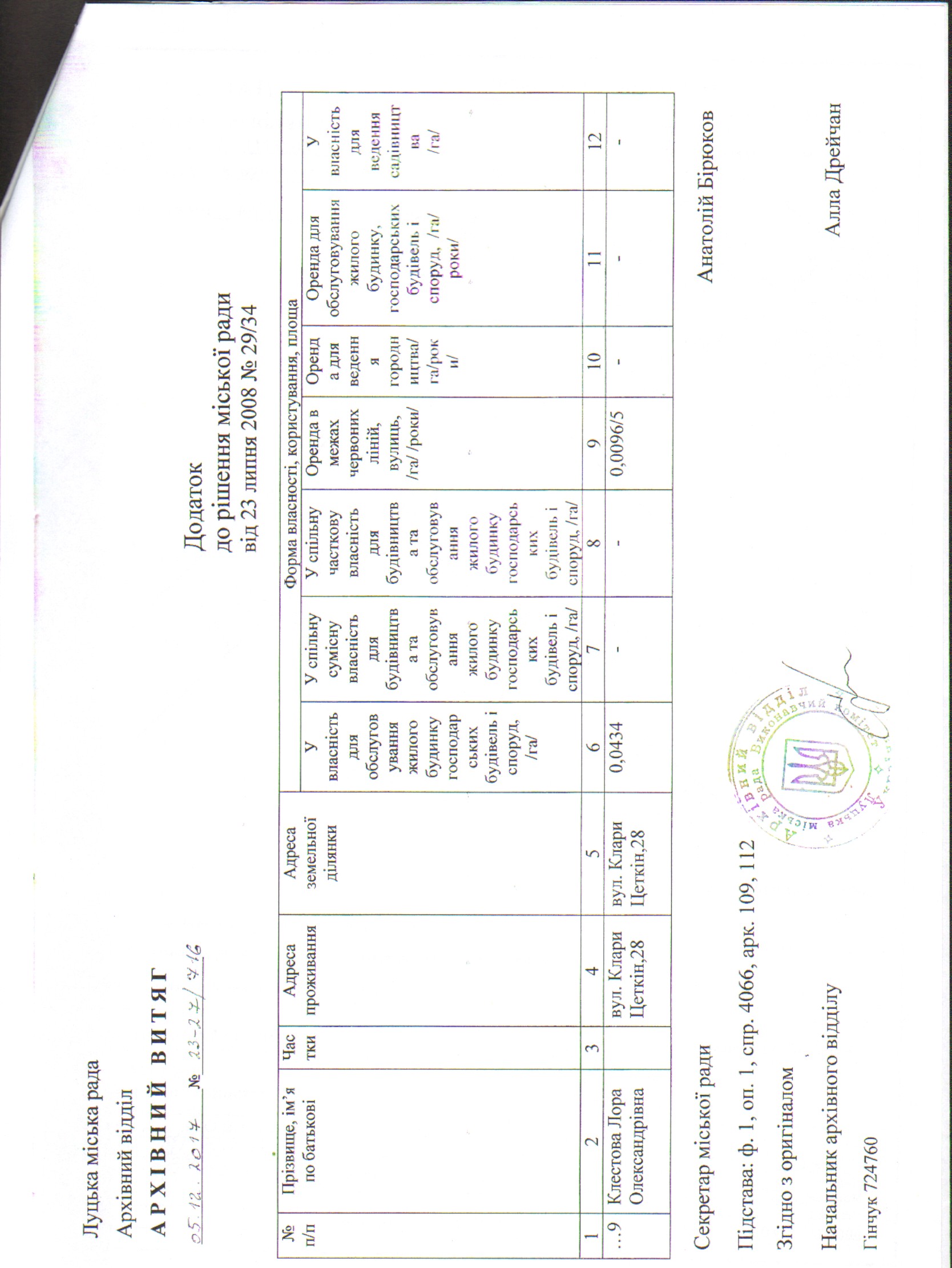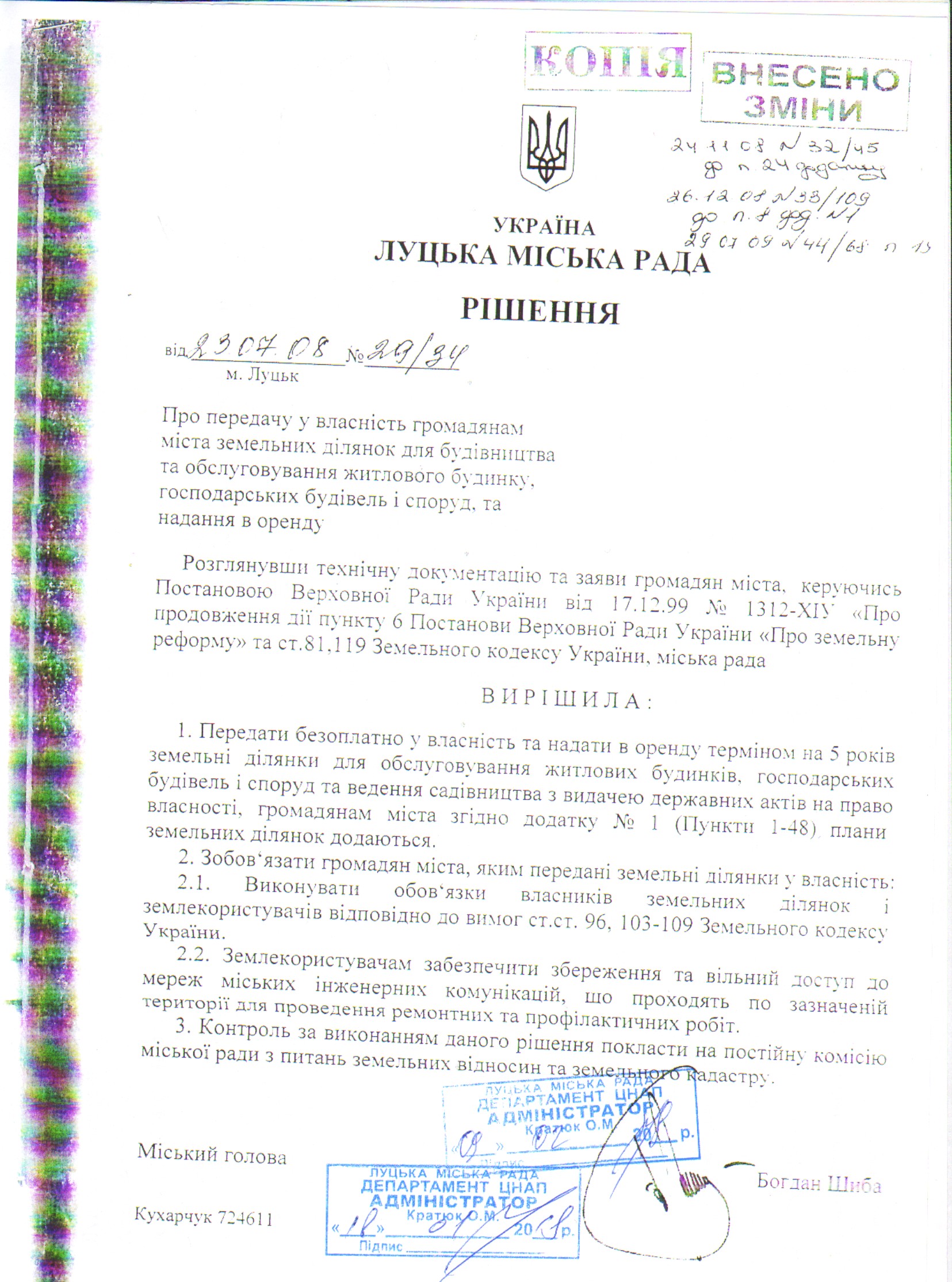 1. Скасувати підпункт 9 пункту 9 рішення Луцької міської ради від 23.07.2008 № 29/34 “Про передачу у власність громадянам міста земельних ділянок для будівництва та обслуговування житлового будинку, господарських будівель і споруд, та надання в оренду” в частині надання земельної ділянки в оренду в межах «червоних ліній» громадянці Клестовій Лорі Олександрівні на вул. Уласа Самчука, 23 (вул. Клари Цеткін, 28) терміном на 5 років, площею 0,0096 га.