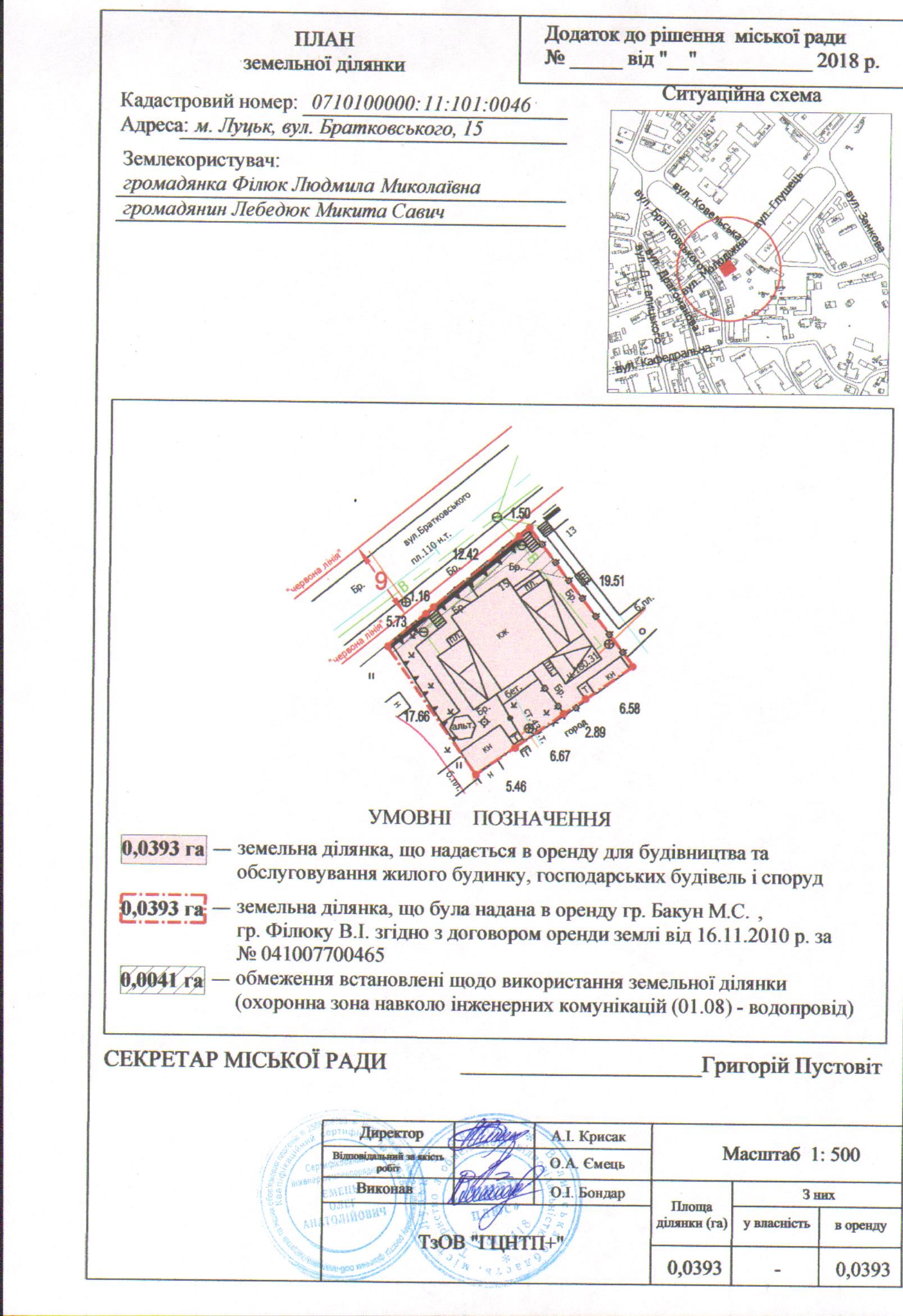 Розглянувши клопотання громадян Філюк Людмили Миколаївни, Лебедюка Микити Савича щодо надання на умовах оренди земельної ділянки на вул. Братковського, 15 для будівництва та обслуговування жилого будинку, господарських будівель і споруд, матеріали технічної документації із землеустрою щодо встановлення (відновлення) меж земельної ділянки в натурі (на місцевості) громадянам Філюк Людмилі Миколаївні, Лебедюку Микиті Савичу, витяг з Державного земельного кадастру про земельну ділянку від 12.06.2018 № НВ-0001677162018, враховуючи державний акт на право постійного користування землею, зареєстрований в Книзі записів державних актів на право постійного користування землею від 17.03.1999 за № 42, виданий на ім’я громадянина Філюка Валентина Ілліча, на земельну ділянку площею 0,0170 га на вул. Братковського, 15/2, свідоцтво про смерть громадянина Філюка Валентина Ілліча від 14.12.2010, серія 1-ЕГ № 103717, керуючись статтями 12, 79-1, 93, 96, 123-126, 141, 186 Земельного кодексу України, статтею 55 Закону України “Про землеустрій”, статтями 4-6, 16, 19 Закону України “Про оренду землі”, статтями 21, 22, 24 Закону України “Про Державний земельний кадастр”, статтею 4 Закону України “Про державну реєстрацію речових прав на нерухоме майно та їх обтяжень”, Законом України “Про внесення змін до деяких законодавчих актів України щодо розмежування земель державної та комунальної власності”, статтею 26 Закону України “Про місцеве самоврядування в Україні”, пунктами 75, 107, 110-111 Постанови Кабінету Міністрів України від 17.10.2012 № 1051 “Про затвердження Порядку ведення Державного земельного кадастру”, пункт 5 рішення Луцької міської ради від 27.08.2015 № 77/97 «Про надання громадянам Філюк Л.М., Лебедюку М.С. на умовах оренди земельної ділянки для будівництва та обслуговування жилого будинку, господарських будівель і споруд на вул. Братковського, 15», міська рада