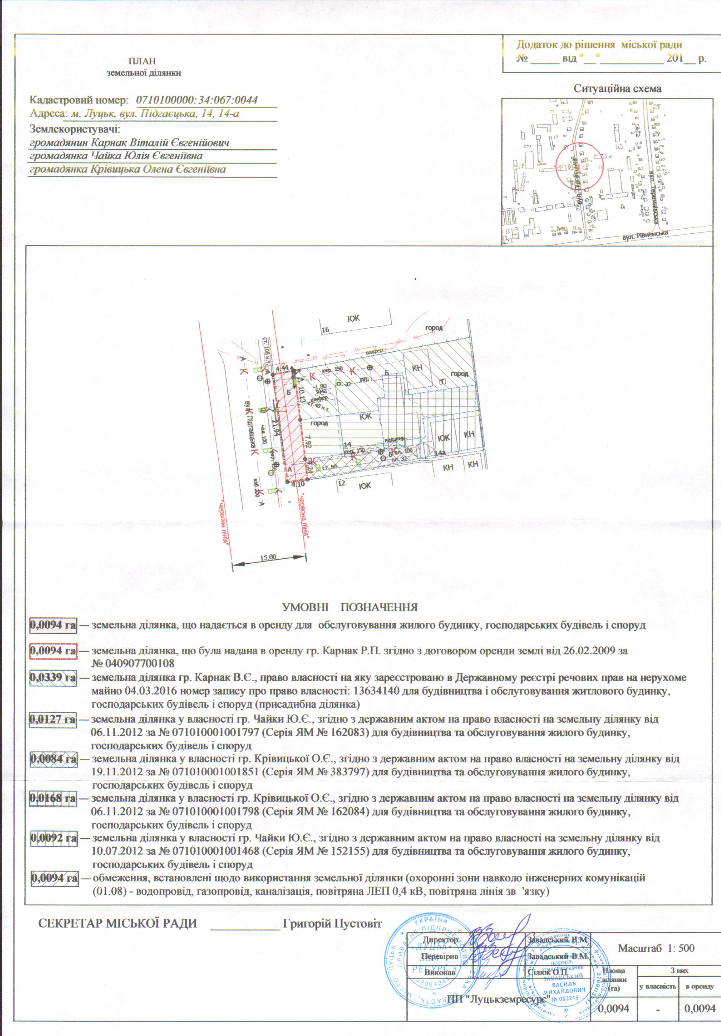 2. Надати громадянам Карнак Віталію Євгенійовичу, Крівицькій Олені Євгеніївні, Чайці Юлії Євгеніївні земельну ділянку на вул. Підгаєцькій, 14, 14-а, на умовах оренди строком на 25 років з дати укладення договору оренди землі, площею 0,0094 га, кадастровим номером 0710100000:34:067:0044, для обслуговування жилого будинку, господарських будівель і споруд, з земель комунальної власності, згідно з додатком.