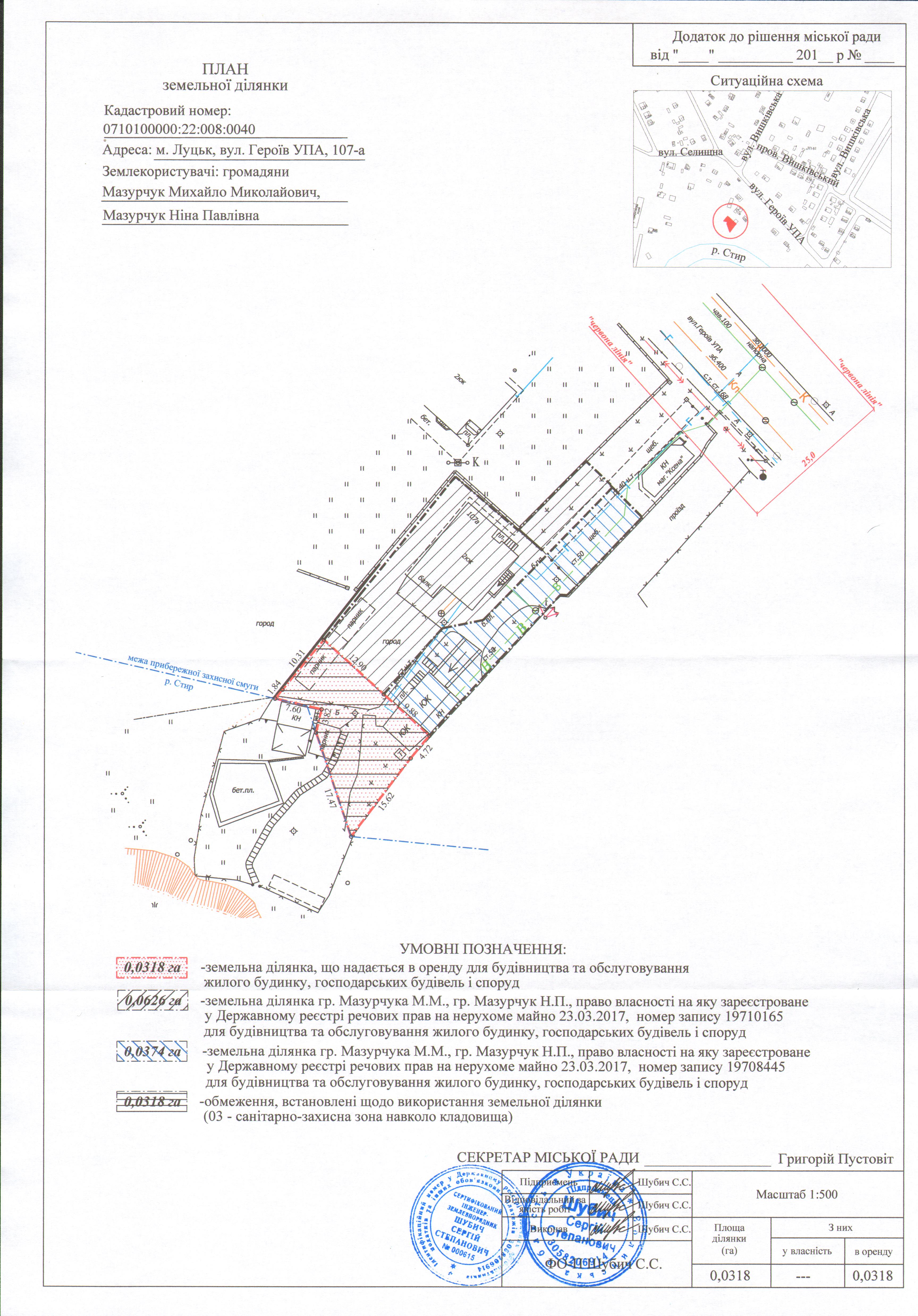 2. Надати громадянам Мазурчуку Михайлу Миколайовичу, Мазурчук Ніні Павлівні земельну ділянку на вул. Героїв УПА, 107-а на умовах оренди строком на 25 років з дати укладення договору оренди землі, площею 0,0318 га, кадастровим номером 0710100000:22:008:0040, для будівництва та обслуговування жилого будинку, господарських будівель і споруд (В 02.01 - для будівництва і обслуговування житлового будинку, господарських будівель і споруд (присадибна ділянка)), згідно з додатком.
