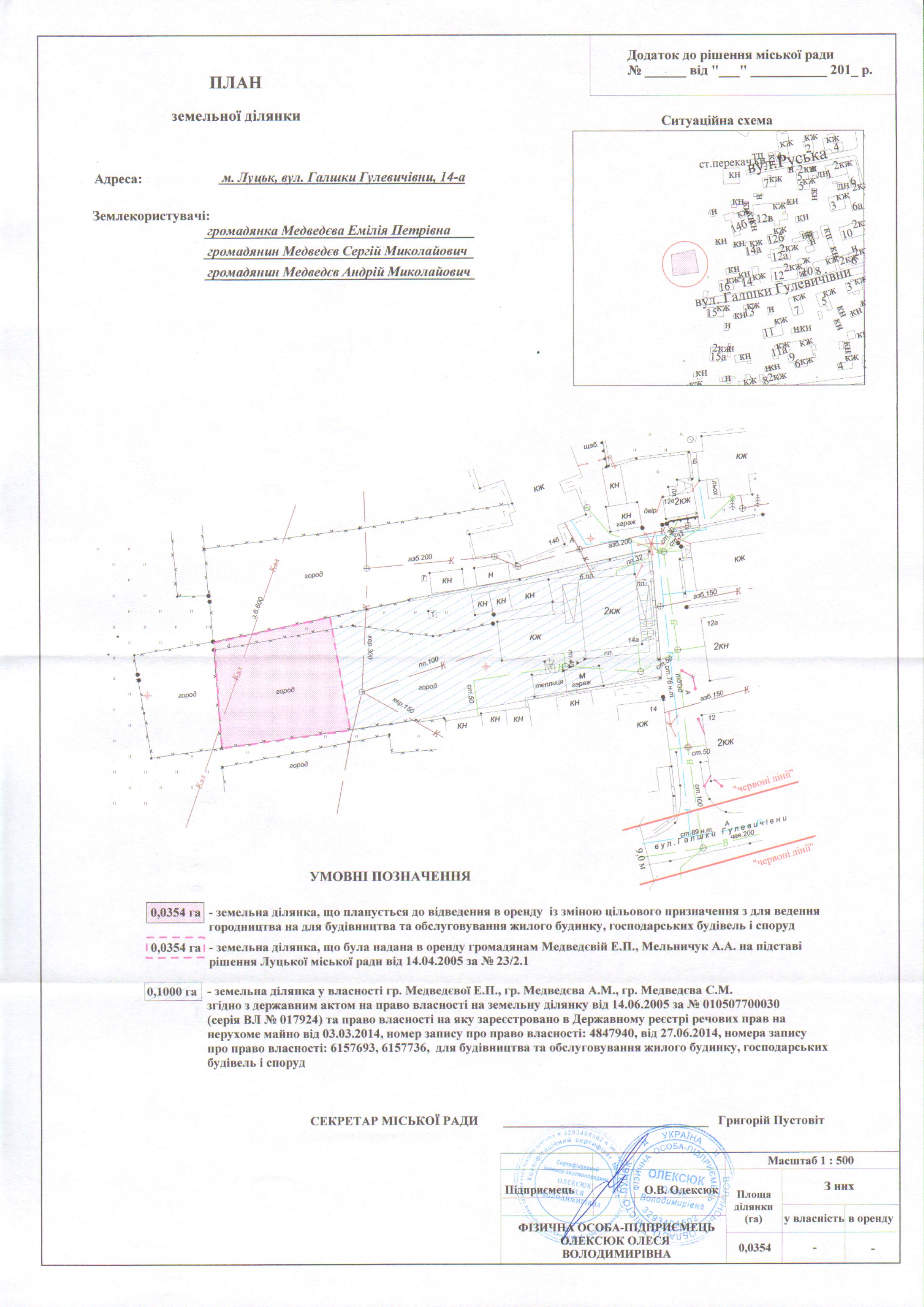 Розглянувши клопотання громадян Медведєвої Емілії Петрівни, Медведєва Сергія Миколайовича, Медведєва Андрія Миколайовича про надання дозволу на розроблення проекту землеустрою щодо відведення земельної ділянки в оренду із зміною цільового призначення з «для ведення городництва» на «для будівництва та обслуговування жилого будинку, господарських будівель і споруд» на вул. Галшки Гулевичівни, 14-а, схему генплану земельної ділянки з прикладеним листом управління містобудування та архітектури Луцької міської ради щодо режиму забудови даної території, визначеної для містобудівних потреб, встановлених у генеральному плані міста Луцька, враховуючи правовстановлюючі документи громадян Медведєвої Емілії Петрівни, Медведєва Сергія Миколайовича, Медведєва Андрія Миколайовича на об’єкти нерухомого майна на вул. Галшки Гулевичівни, 14-а: витяг з Державного реєстру речових прав на нерухоме майно про реєстрацію права власності від 09.11.2017, індексний номер витягу: 103192236, відповідно до якого право власності громадянки Медведєвої Емілії Петрівни на квартиру № 1 зареєстроване 01.11.2017, номер запису про право власності: 23209160, технічний паспорт на об’єкт нерухомого майна від 10.07.2017; витяг з Державного реєстру речових прав на нерухоме майно про реєстрацію права власності від 09.11.2017, індексний номер витягу: 103190369 відповідно до якого право власності громадянина Медведєва Сергія Миколайовича на квартиру № 2 зареєстроване 01.11.2017, номер запису про право власності: 23207913, технічний паспорт на об’єкт нерухомого майна від 10.07.2017; витяг з Державного реєстру речових прав на нерухоме майно про реєстрацію права власності від 09.11.2017, індексний номер витягу: 103191603, відповідно до якого право власності громадянина Медведєва Андрія Миколайовича на квартиру № 3 зареєстроване 01.11.2017, номер запису про право власності: 23208687, технічний паспорт на об’єкт нерухомого майна від 10.07.2017; державний акт на право власності на земельну ділянку площею 0,1000 га, зареєстрований в Поземельній книзі від 18.11.2009 за № 077111410008001, відповідно до якого громадянці Медведєвій Емілії Петрівні належить 32/100 часток земельної ділянки; договір дарування від 27.06.2014 за № 405, відповідно до якого право власності громадянина Медведєва Сергія Миколайовича на 45/100 частки земельної ділянки загальною площею 0,1000 га зареєстроване в Державному реєстрі речових прав на нерухоме майно від 27.06.2014, номер запису про право власності: 6157736, а громадянина Медведєва Андрія Миколайовича на 23/100 частки земельної ділянки загальною площею 0,1000 га зареєстроване в Державному реєстрі речових прав на нерухоме майно від 27.06.2014, номер запису про право власності: 6157693; керуючись статтями 12, 20, 79-1, 93, 123 Земельного кодексу України, статтею 6 Закону України «Про оренду землі», статтею 50 Закону України «Про землеустрій», Законом України «Про регулювання містобудівної діяльності», Законом України «Про внесення змін до деяких законодавчих актів України щодо розмежування земель державної та комунальної власності», статтею 26 Закону України «Про місцеве самоврядування в Україні», рішенням Луцької міської ради від 14.04.2005 № 23/2.1 “Про передачу у власність громадянам міста земельних ділянок для обслуговування жилого будинку, господарських будівель і споруд та ведення садівництва”, міська рада