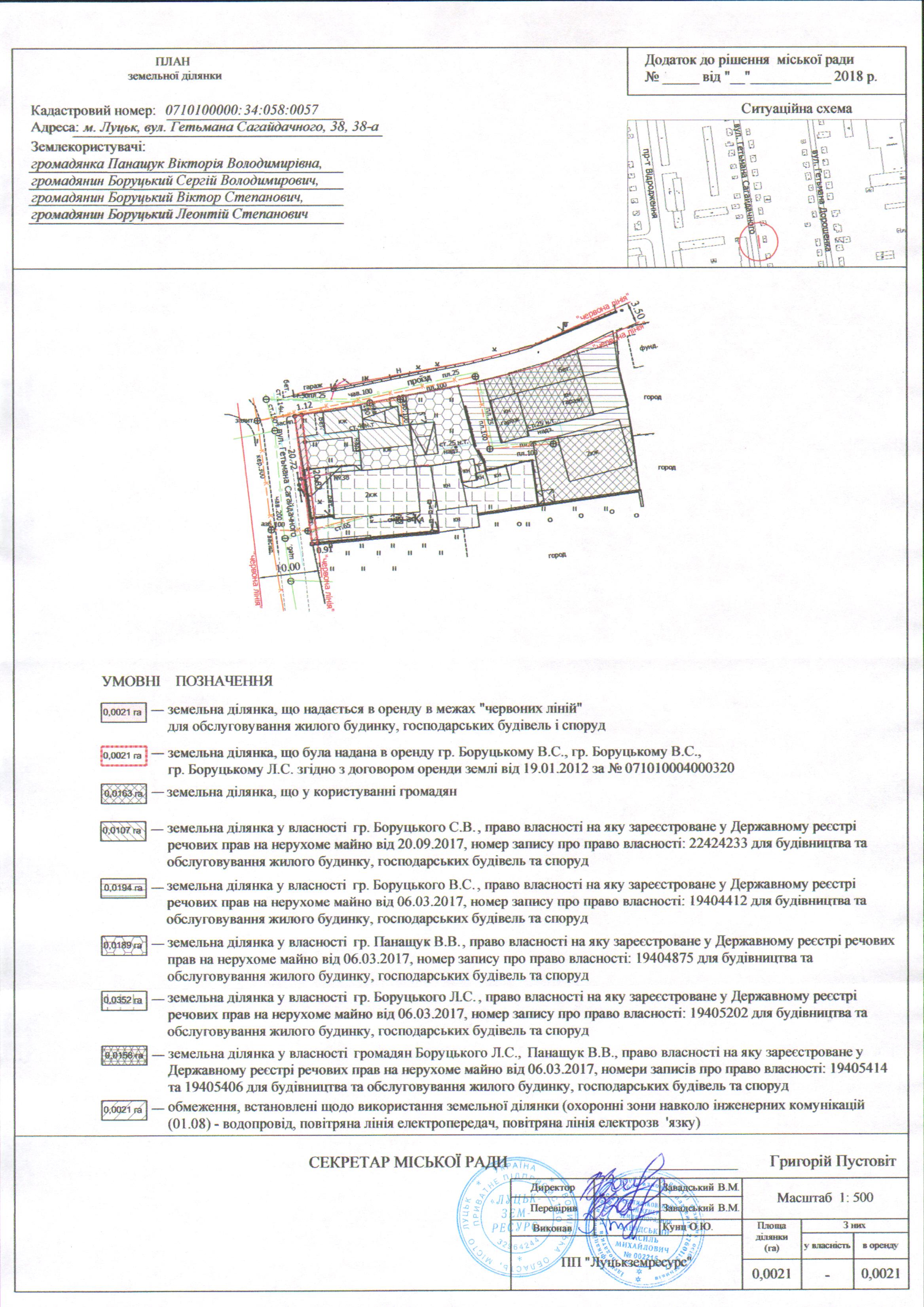 2. Надати громадянам Панащук Вікторії Володимирівні, Боруцькому Сергію Володимировичу, Боруцькому Віктору Степановичу, Боруцькому Леонтію Степановичу земельну ділянку на вул. Гетьмана Сагайдачного, 38, 38-а, на умовах оренди строком на 25 років з дати укладення договору оренди землі, площею 0,0021 га, кадастровим номером 0710100000:34:058:0057, в межах “червоних ліній” для обслуговування жилого будинку, господарських будівель і споруд, з земель комунальної власності, згідно з додатком.