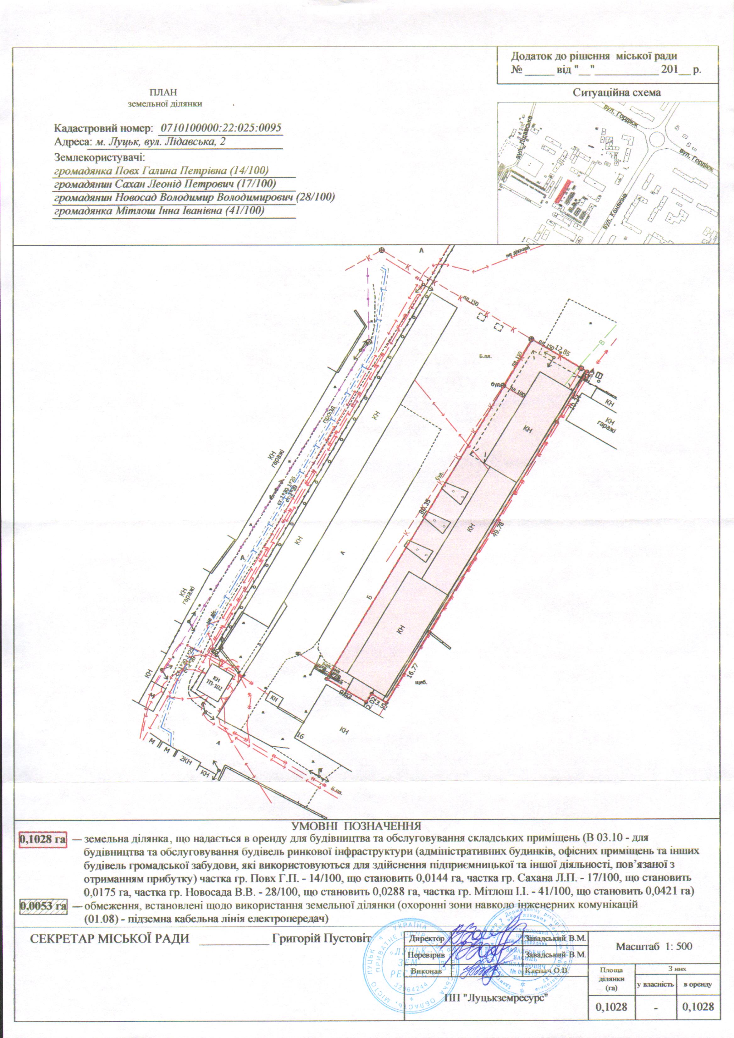2. Надати громадянам Повх Галині Петрівні, Сахану Леоніду Петровичу, Новосаду Володимиру Володимировичу, Мітлош Інні Іванівні земельну ділянку на вул. Лідавській, 2, на умовах оренди строком на 10 років з дати укладення договору оренди землі, площею 0,1028 га, кадастровим номером 0710100000:22:025:0095, для будівництва та обслуговування складських приміщень (В 03.10 - для будівництва та обслуговування будівель ринкової інфраструктури (адміністративних будинків, офісних приміщень та інших будівель громадської забудови, які використовуються для здійснення підприємницької та іншої діяльності, пов’язаної з отриманням прибутку), (частка громадянки Повх Галини Петрівни 14/100, що становить 0,0144 га, частка громадянина Сахана Леоніда Петровича 17/100, що становить 0,0175 га, частка громадянина Новосада Володимира Володимировича 28/100, що становить 0,0288 га, частка громадянки Мітлош Інни Іванівни 41/100, що становить 0,0421 га), згідно з додатком.
