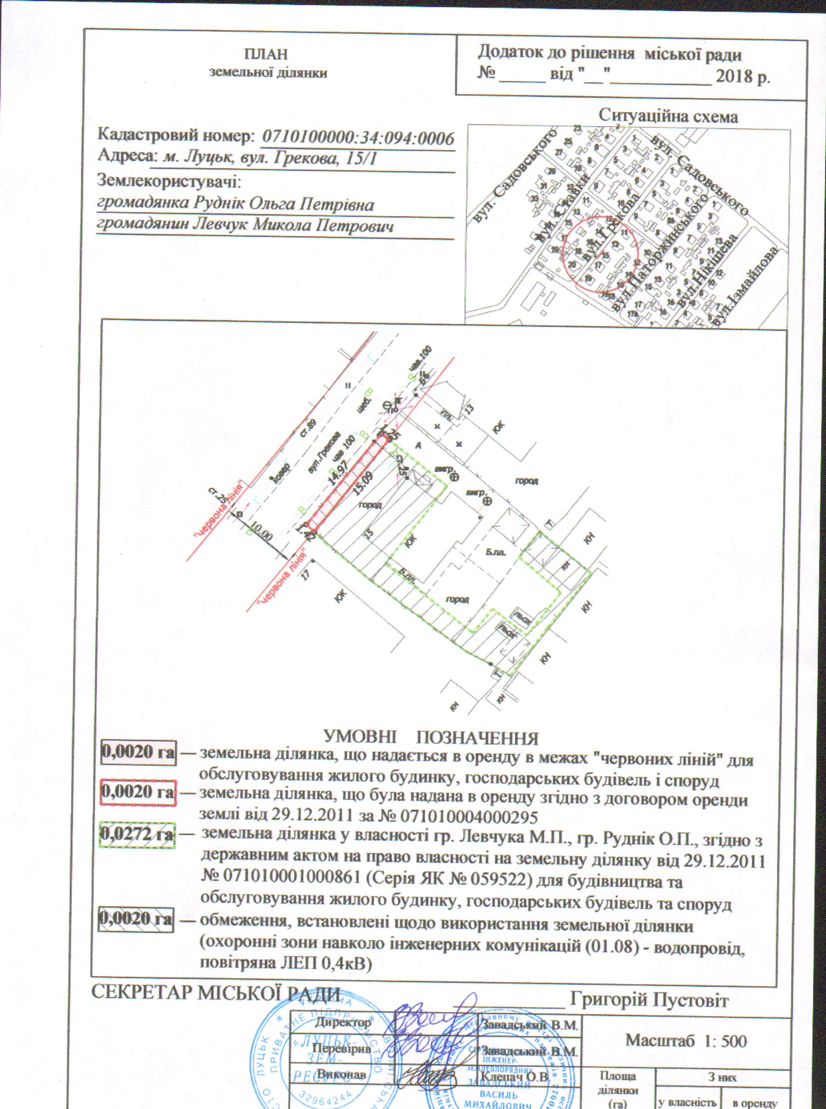 2. Надати громадянам Руднік Ользі Петрівні, Левчуку Миколі Петровичу земельну ділянку на вул. Грекова, 15/1, на умовах оренди строком на 25 років з дати укладення договору оренди землі, площею 0,0020 га, кадастровим номером 0710100000:34:094:0006, в межах “червоних ліній” для обслуговування жилого будинку, господарських будівель і споруд, з земель комунальної власності, згідно з додатком.