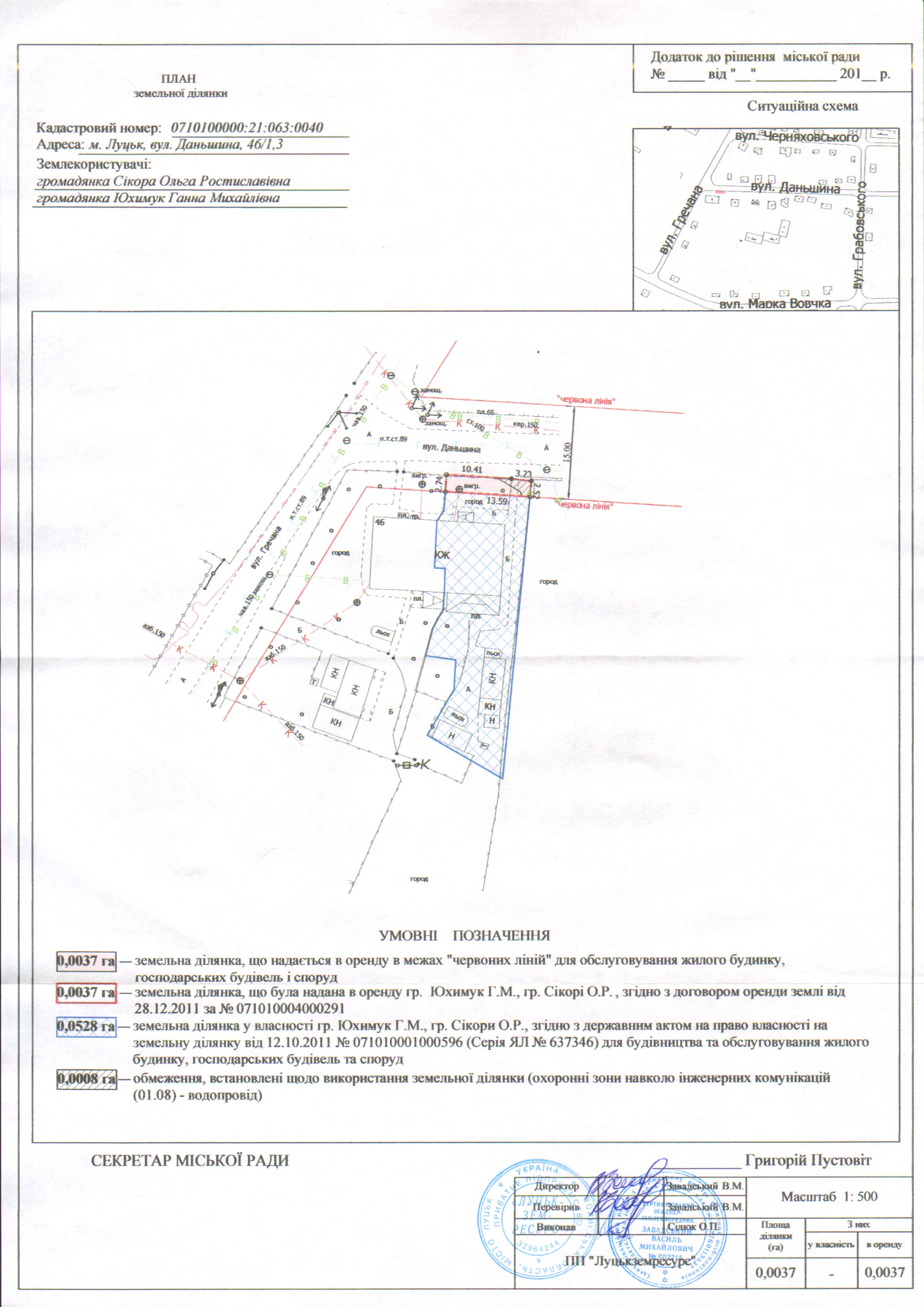 2. Надати громадянам Сікорі Ользі Ростиславівні, Юхимук Ганні Михайлівні земельну ділянку на вул. Даньшина, 46/1,3, на умовах оренди строком на 25 років з дати укладення договору оренди землі, площею 0,0037 га, кадастровим номером 0710100000:21:063:0040, в межах “червоних ліній” для обслуговування жилого будинку, господарських будівель і споруд, з земель комунальної власності, згідно з додатком.