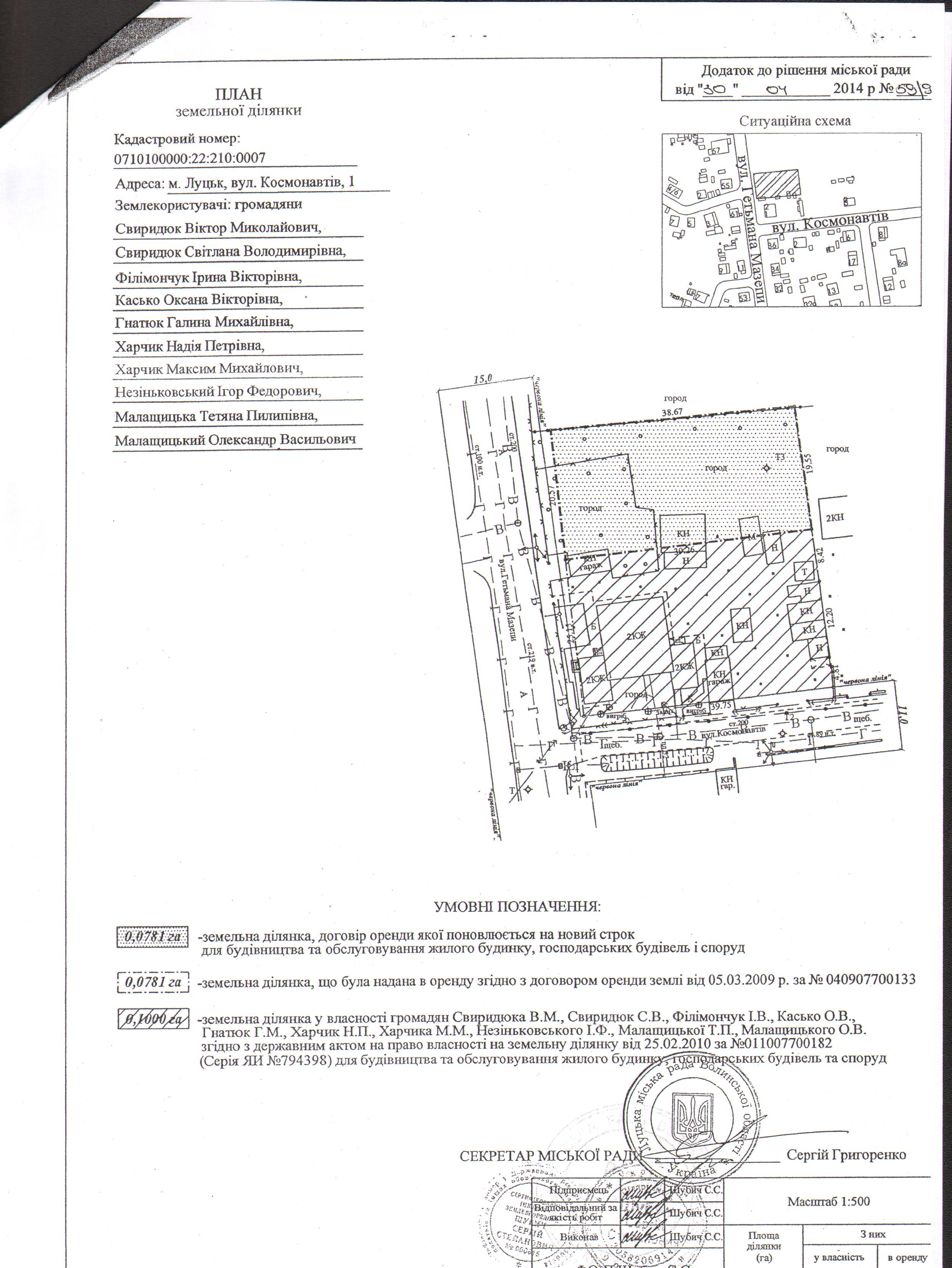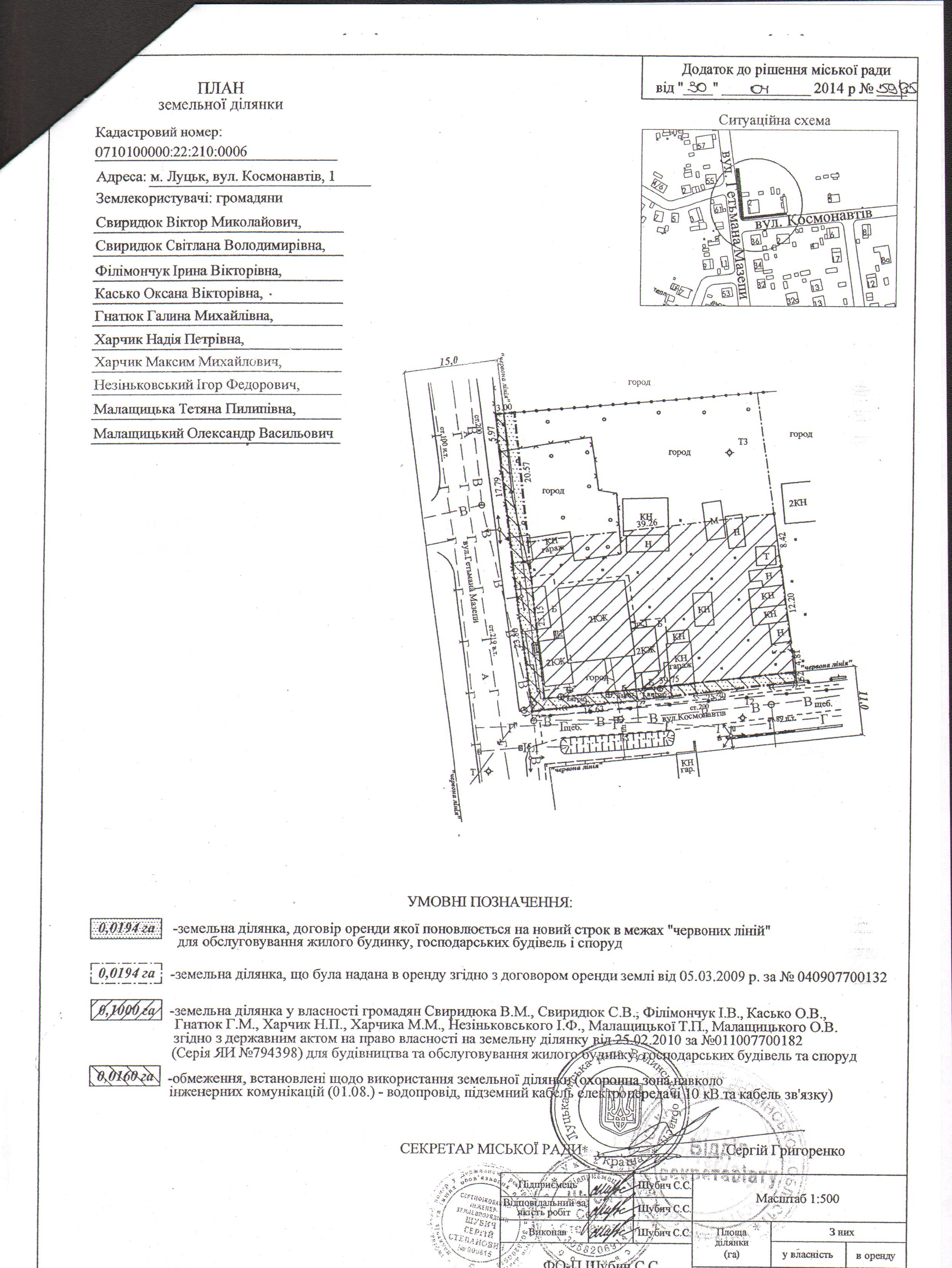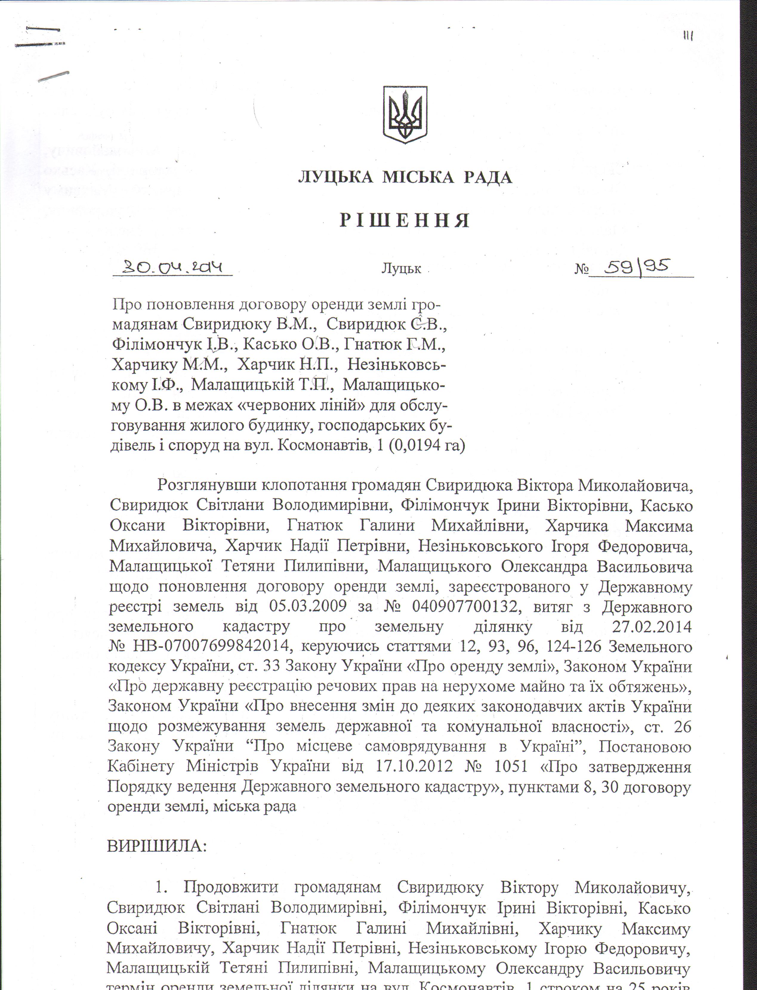 4. Рішення Луцької міської ради від 30.04.2014 № 59/95 “Про поновлення договору оренди землі громадянам Свиридюку В.М., Свиридюк С.В., Філімончук І.В., Касько О.В., Гнатюк Г.М., Харчику М.М., Харчик Н.П., Незіньковському І.Ф., Малащицькій Т.П., Малащицькому О.В. в межах «червоних ліній» для обслуговування жилого будинку, господарських будівель і споруд на вул. Космонавтів, 1 (0,0194 га)” втратило чинність у зв’язку із неукладенням додаткової угоди про поновлення договору оренди оренди землі.