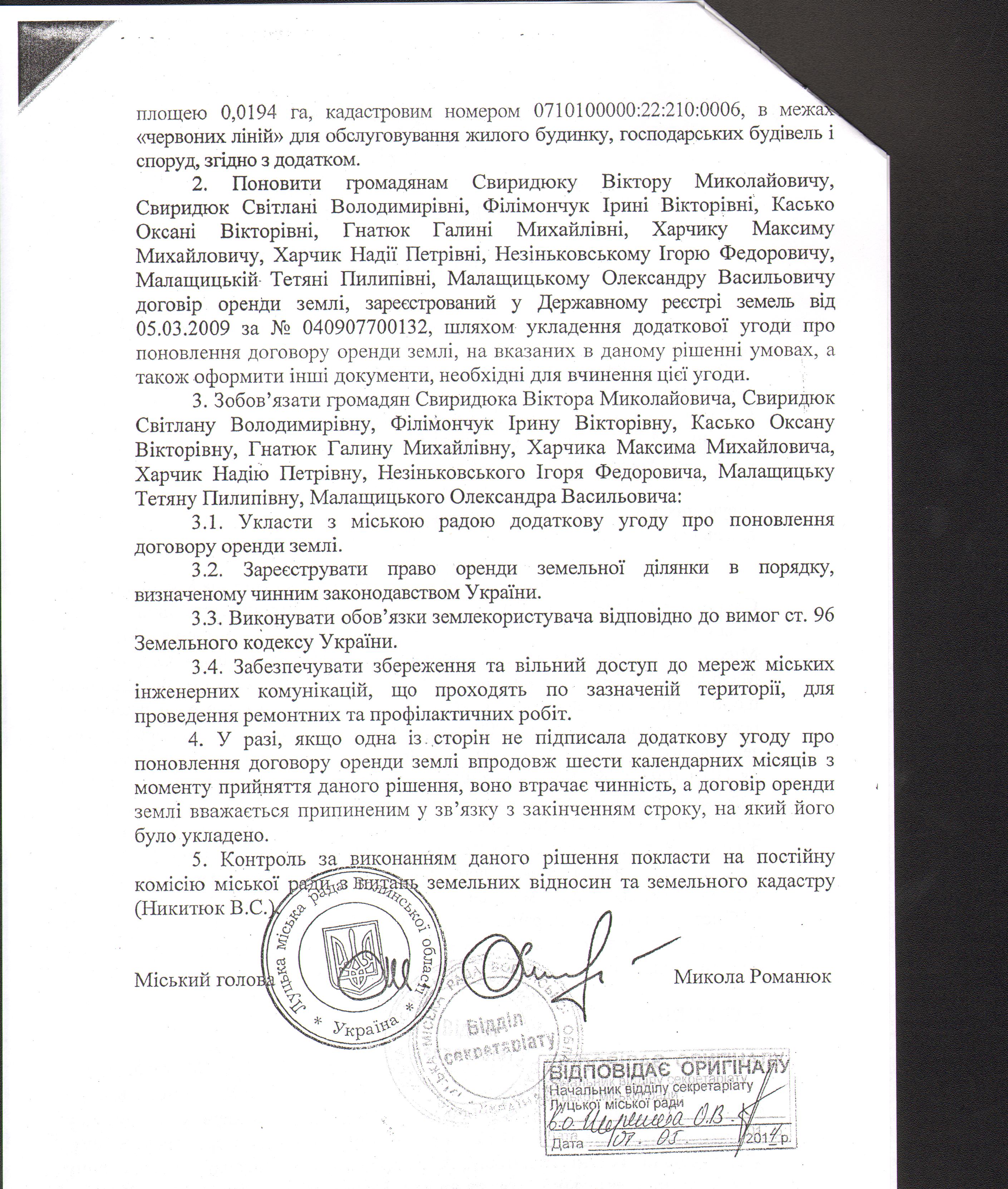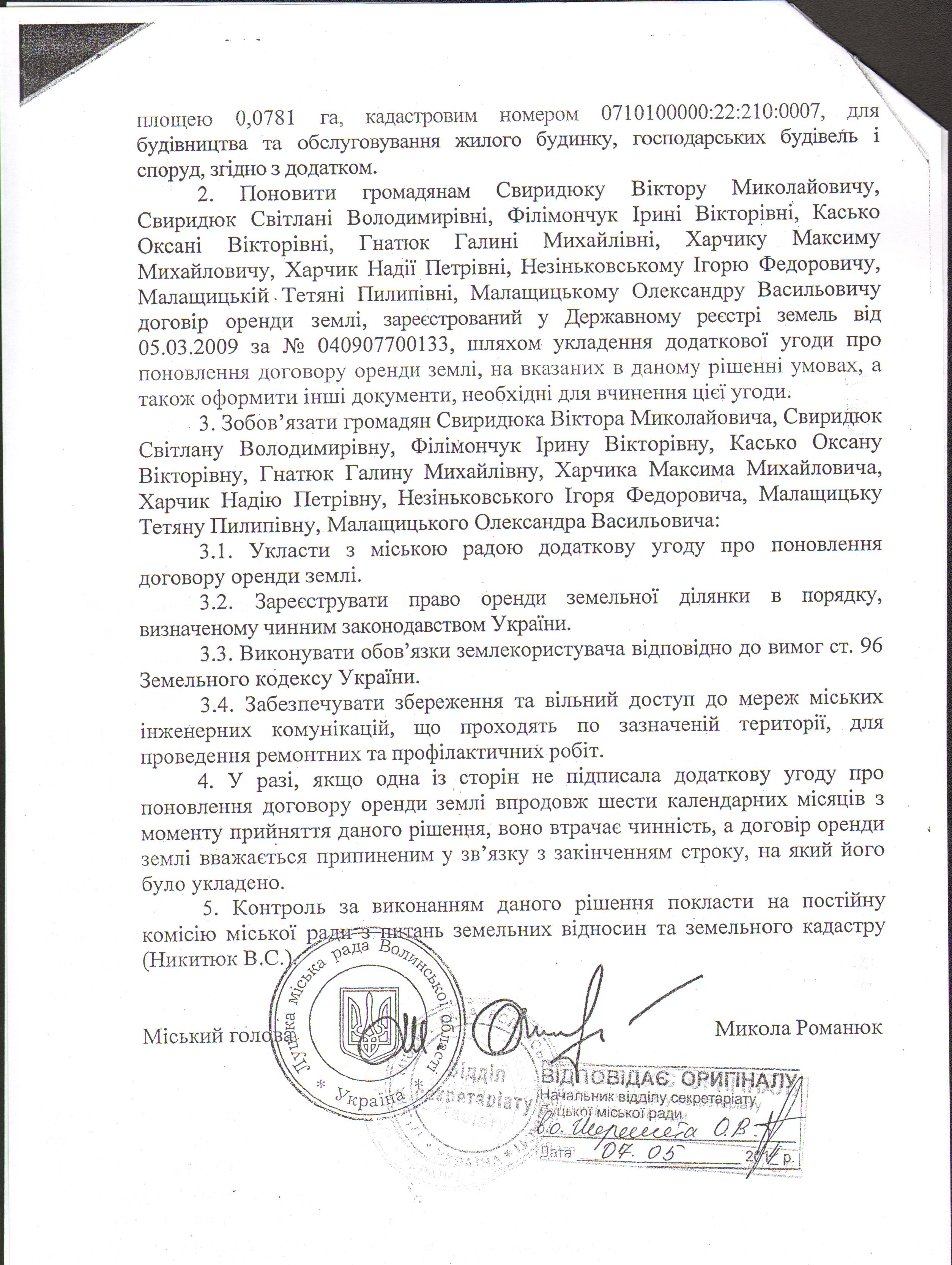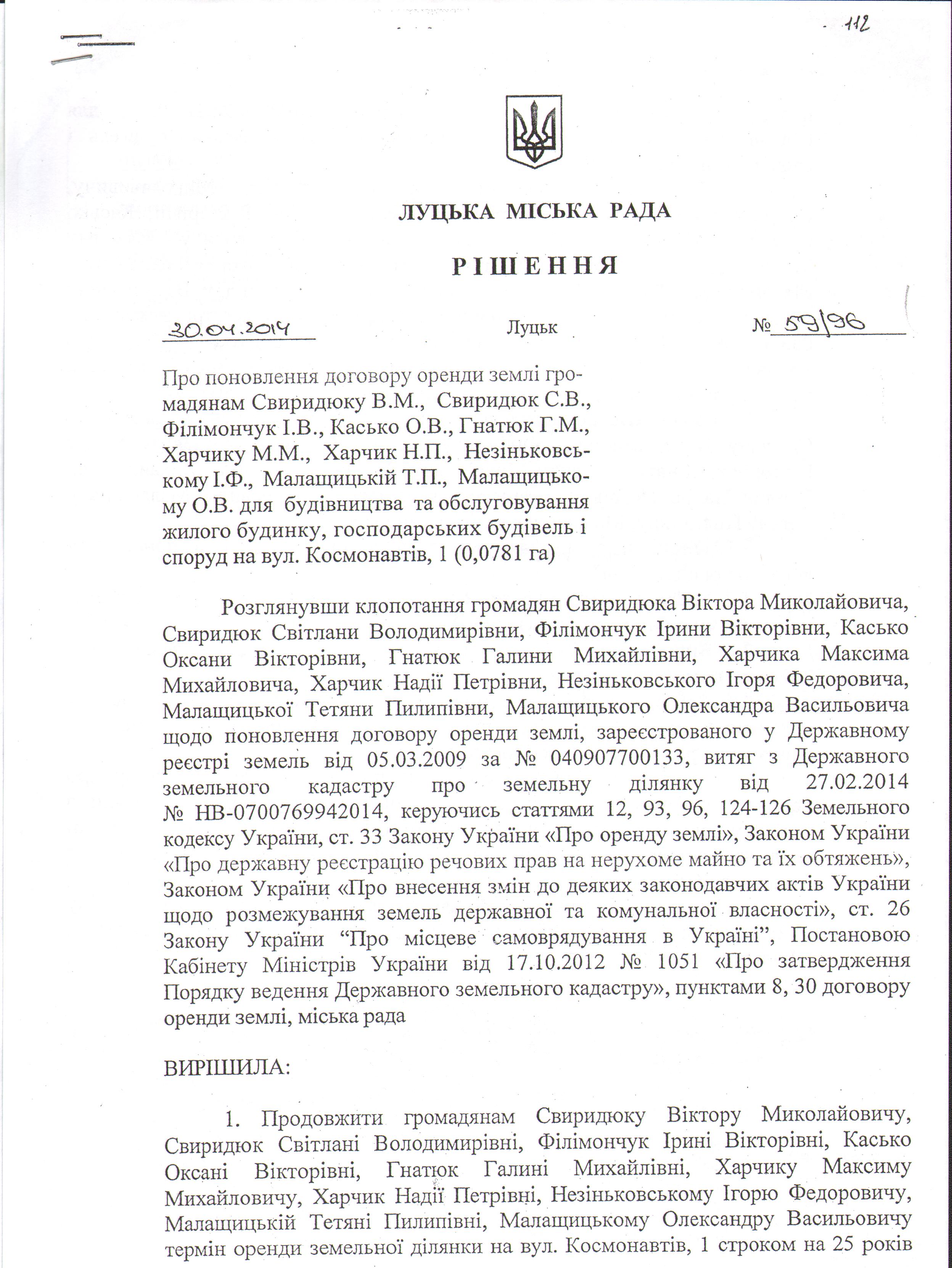 5. Рішення Луцької міської ради від 30.04.2014 № 59/96 “Про поновлення договору оренди землі громадянам Свиридюку В.М., Свиридюк С.В., Філімончук І.В., Касько О.В., Гнатюк Г.М., Харчику М.М., Харчик Н.П., Незіньковському І.Ф., Малащицькій Т.П., Малащицькому О.В. для будівництва та обслуговування жилого будинку, господарських будівель і споруд на вул. Космонавтів, 1 (0,0781 га)” втратило чинність у зв’язку із неукладенням додаткової угоди про поновлення договору оренди оренди землі.