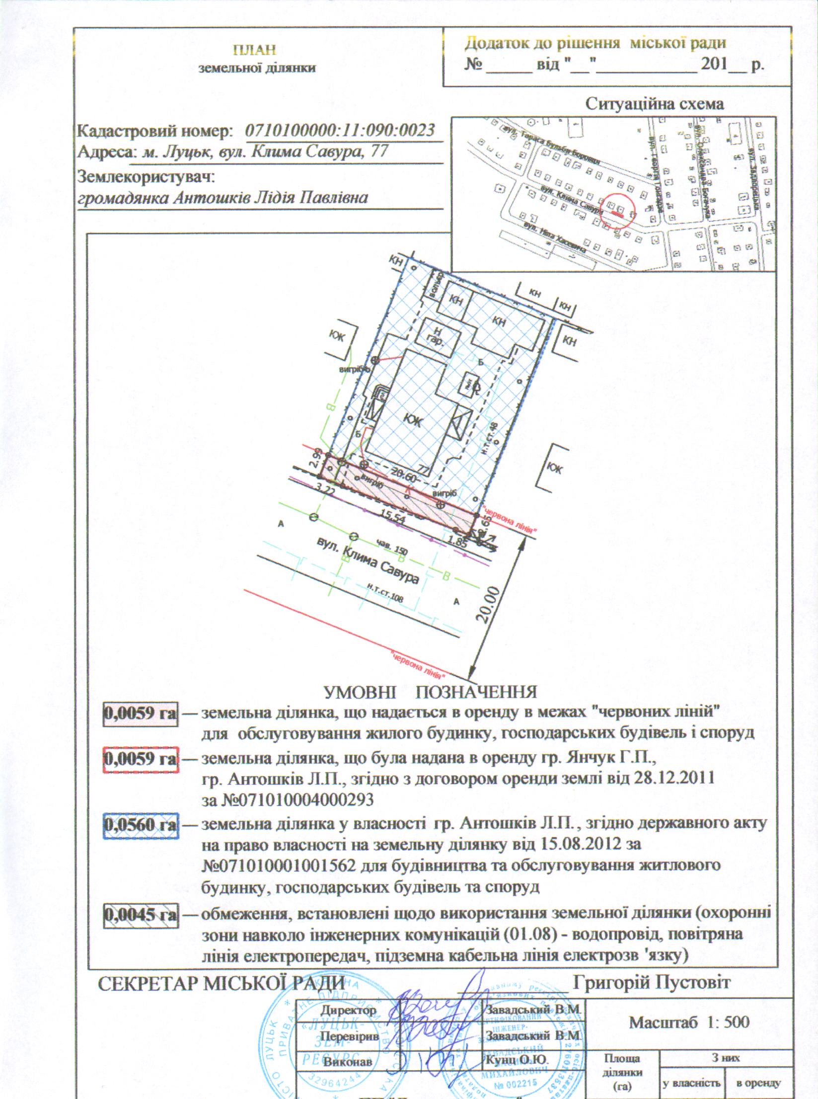 2. Надати громадянці Антошків Лідії Павлівні земельну ділянку на вул. Клима Савура, 77, на умовах оренди строком на 25 років з дати укладення договору оренди землі, площею 0,0059 га, кадастровим номером 0710100000:11:090:0023, в межах “червоних ліній” для обслуговування жилого будинку, господарських будівель і споруд, з земель комунальної власності, згідно з додатком.