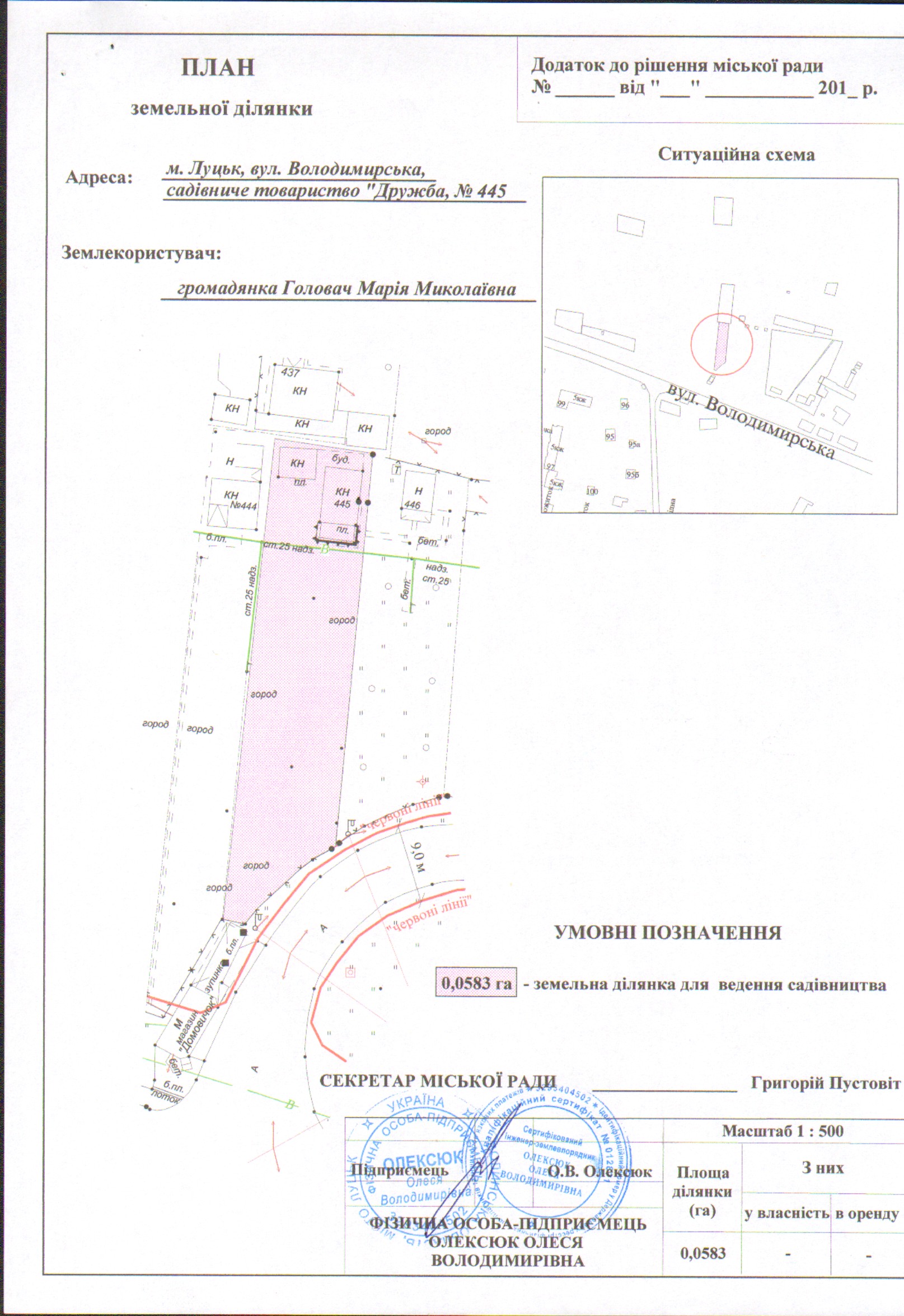 Розглянувши заяву громадянки Головач Марії Миколаївни про надання дозволу на розроблення технічної документації із землеустрою щодо встановлення (відновлення) меж земельної ділянки в натурі (на місцевості) на вул. Володимирській в садівничому товаристві «Дружба» №445, довідку із садівничого товариства «Дружба», керуючись статтями 12, 96, 116, 118, 120, 121 Земельного кодексу України, Законом України «Про внесення змін до деяких законодавчих актів України щодо розмежування земель державної та комунальної власності», Законом України «Про землеустрій», Законом України «Про Державний земельний кадастр», Постановою Кабінету Міністрів України від 17.10.2012р. №1051 «Про затвердження Порядку ведення Державного земельного кадастру», ст. 26 Закону України «Про місцеве самоврядування в Україні» Генеральним планом міста Луцька, затвердженим рішенням міської ради від 24.06.2009 №42/1 «Про затвердження Генерального плану міста», планом зонування міста Луцька, затвердженим рішенням міської ради від 31.03.2014 №57/30 «Про затвердження плану зонування території міста Луцька», міська рада