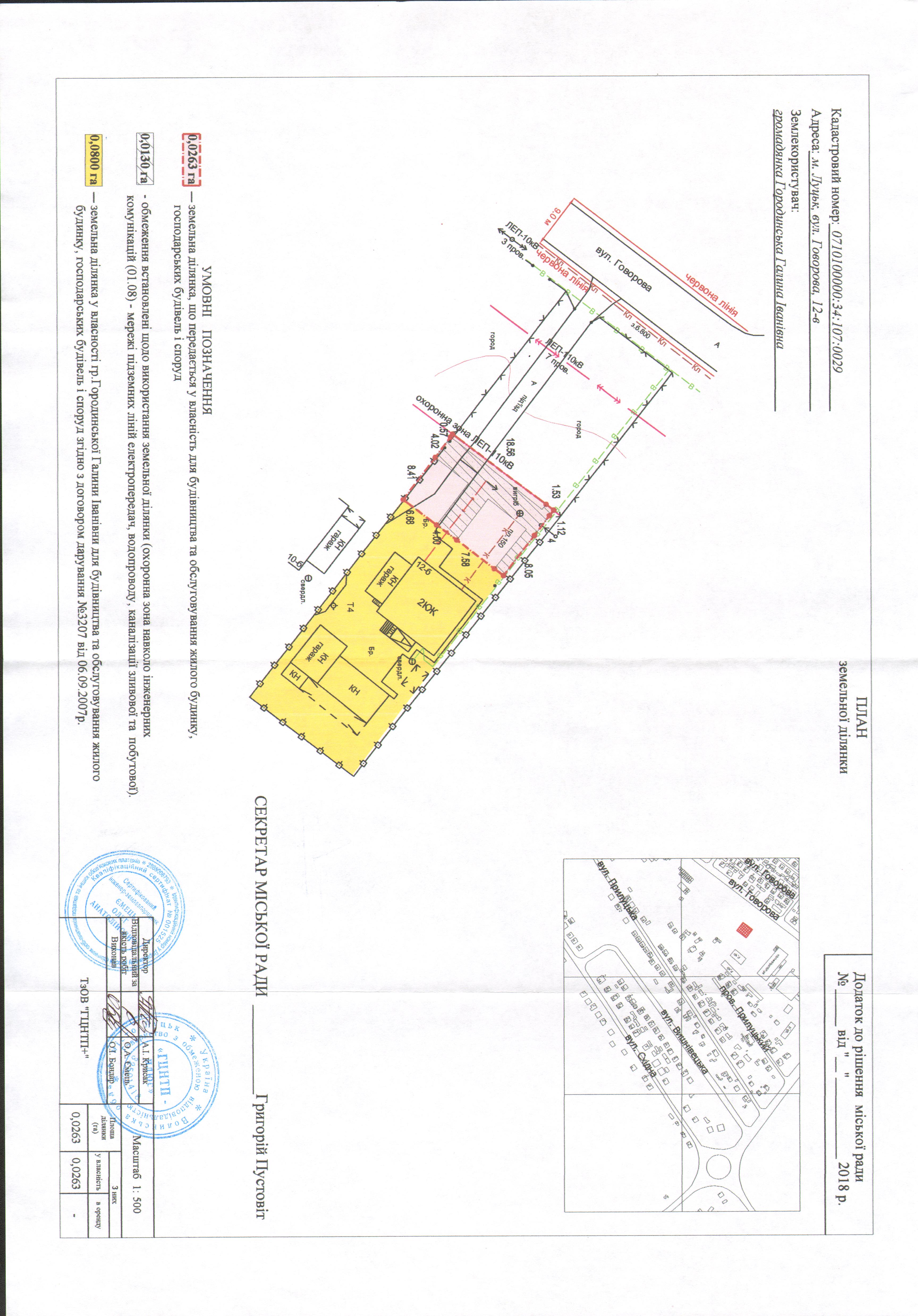2. Надати громадянці Городинській Галині Іванівні у власність земельну ділянку на вул. Говорова, 12-в площею 0,0263 га, кадастровим номером 0710100000:34:107:0029 для будівництва та обслуговування жилого будинку, господарських будівель і споруд, згідно з додатком.