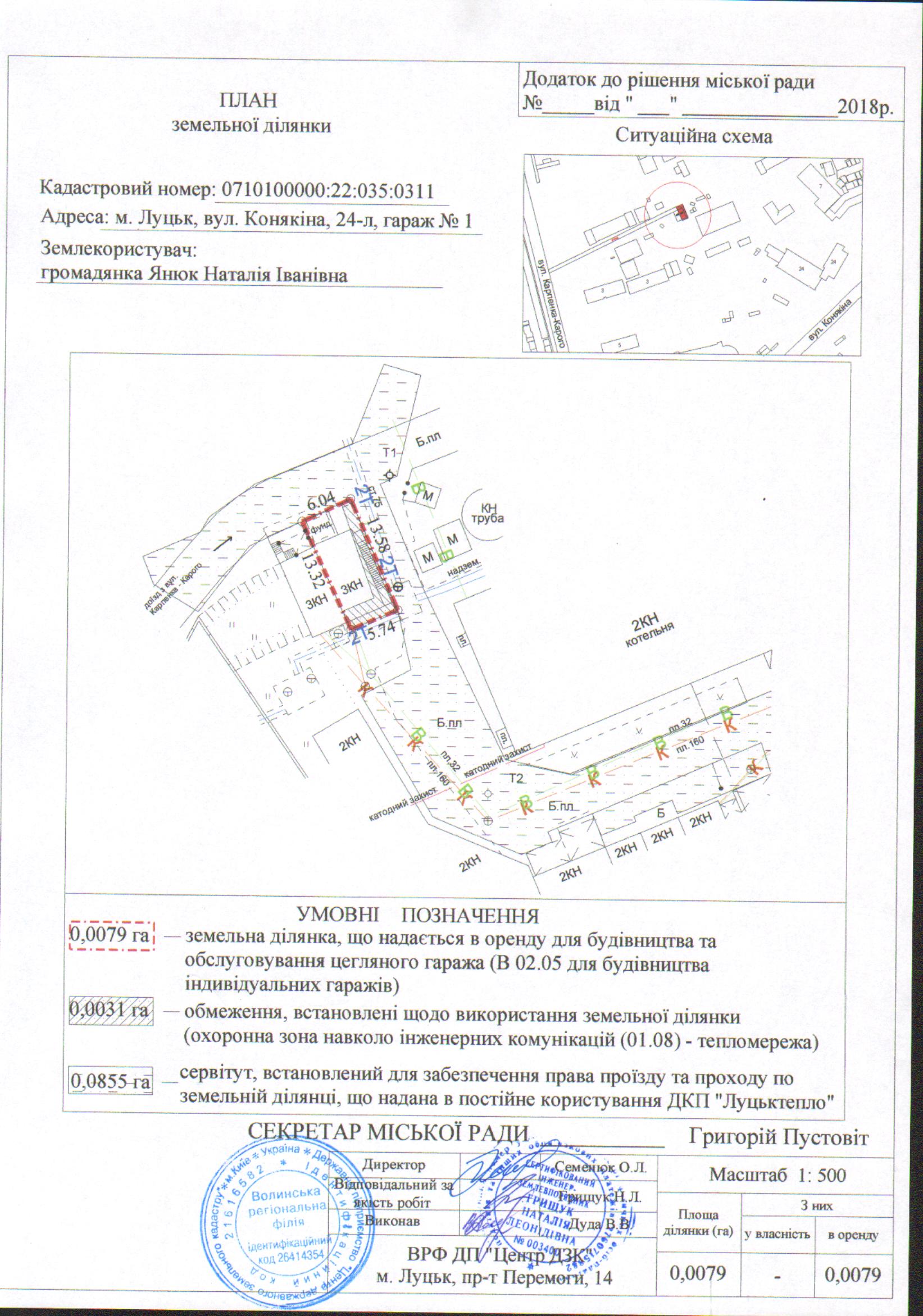 2. Надати громадянці Янюк Наталії Іванівні земельну ділянку на вул. Конякіна, 24-л, гараж № 1 на умовах оренди строком на 25 років з дати укладення договору оренди землі, площею 0,0079 га, кадастровим номером 0710100000:22:035:0311, для будівництва та обслуговування цегляного гаража (В 02.05 – для будівництва індивідуальних гаражів), згідно з додатком.