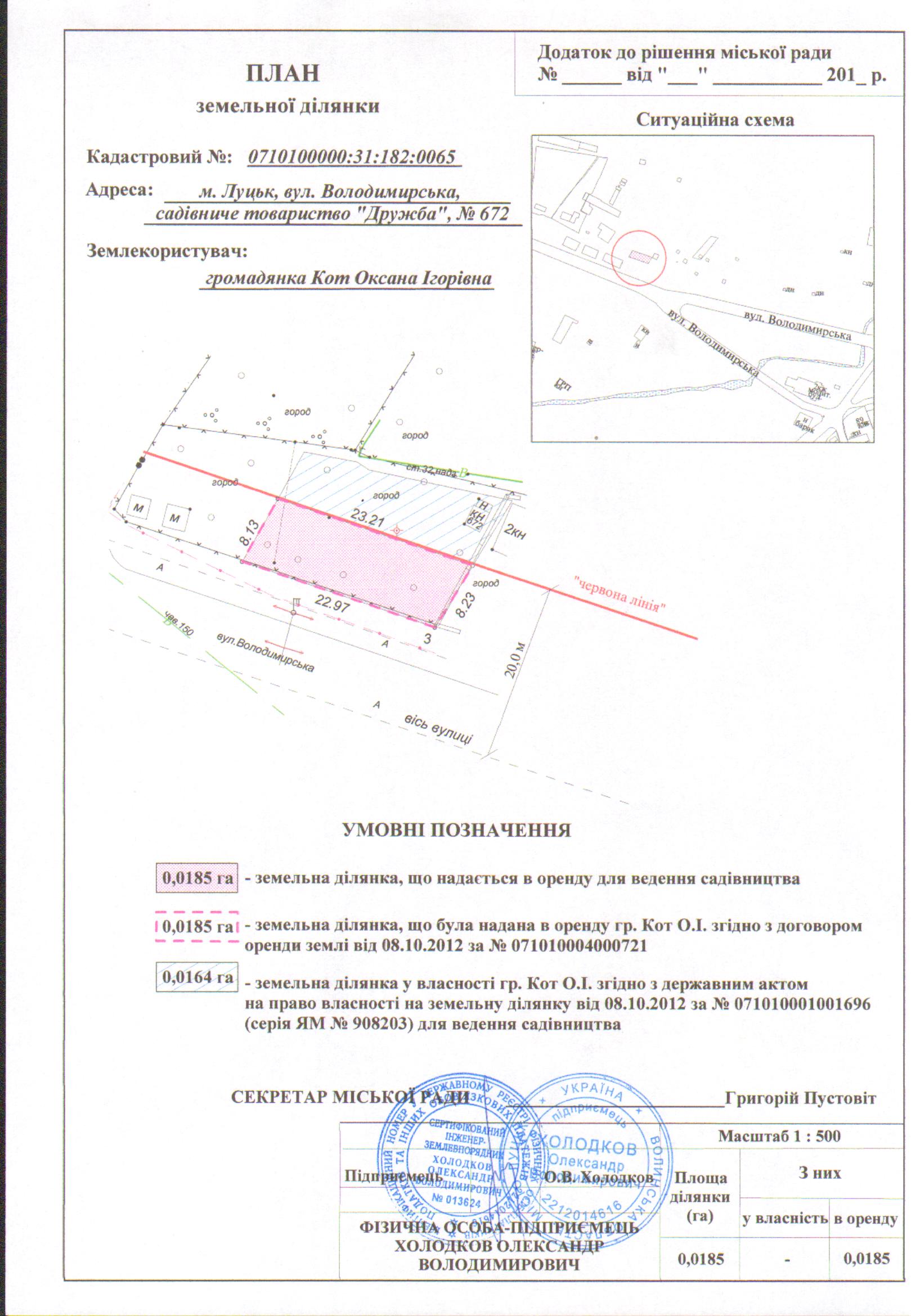 2. Надати громадянці Кот Оксані Ігорівні земельну ділянку на вул. Володимирській, садівниче товариство “Дружба”, № 672, на умовах оренди строком на 25 років з дати укладення договору оренди землі, площею 0,0185 га, кадастровим номером 0710100000:31:182:0065, для ведення садівництва, з земель комунальної власності, згідно з додатком.