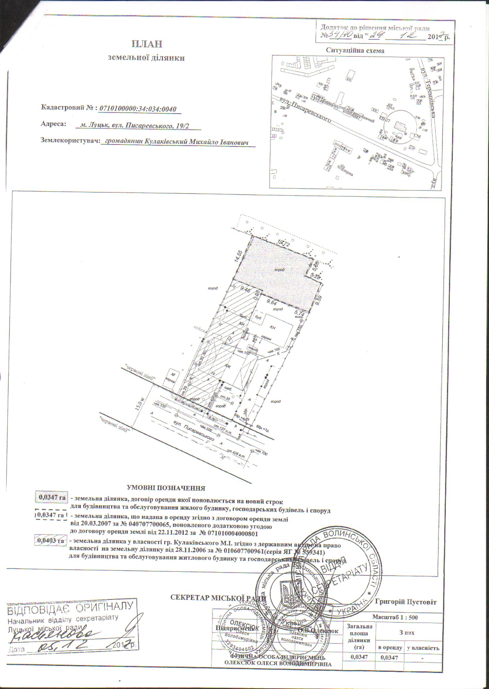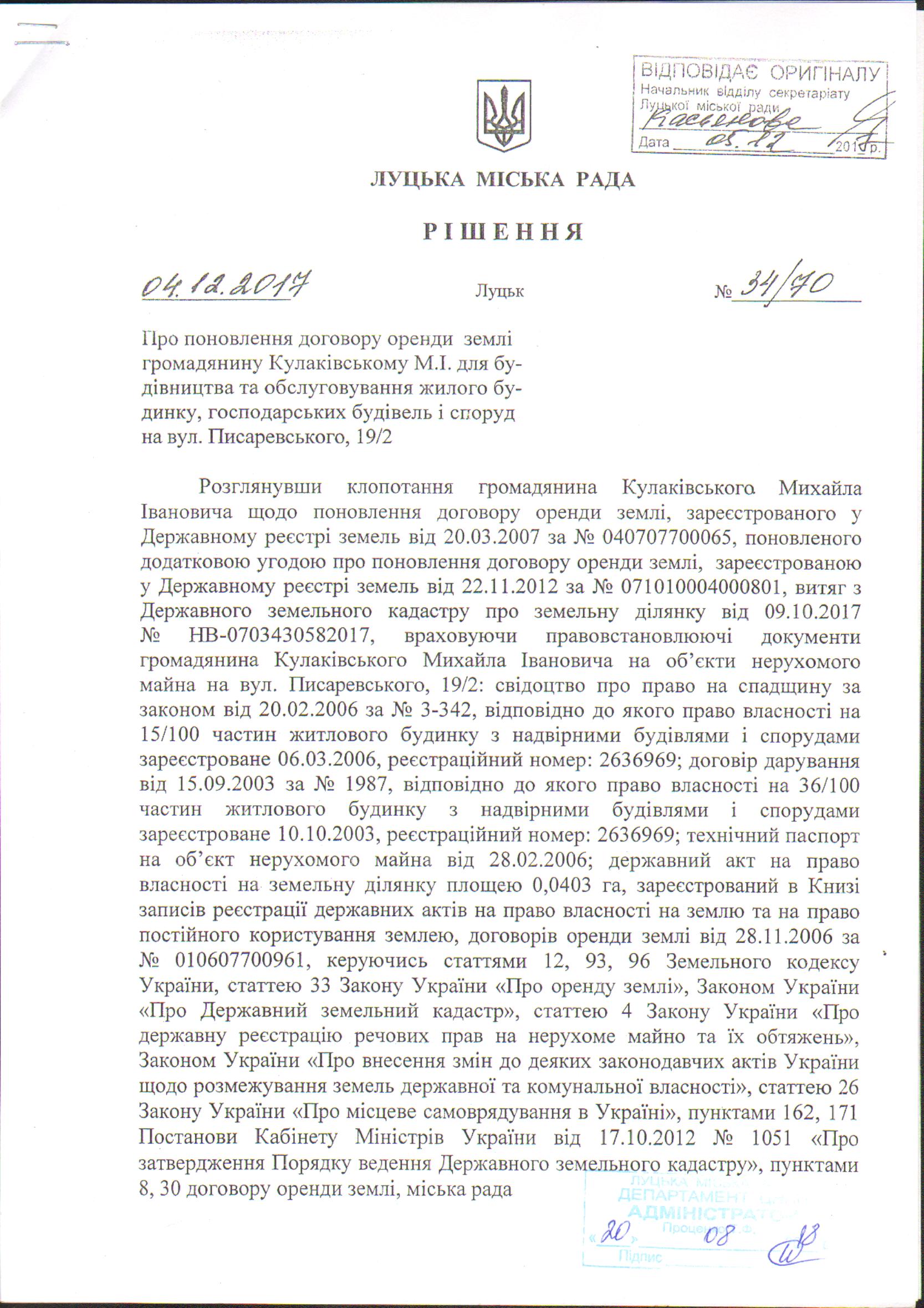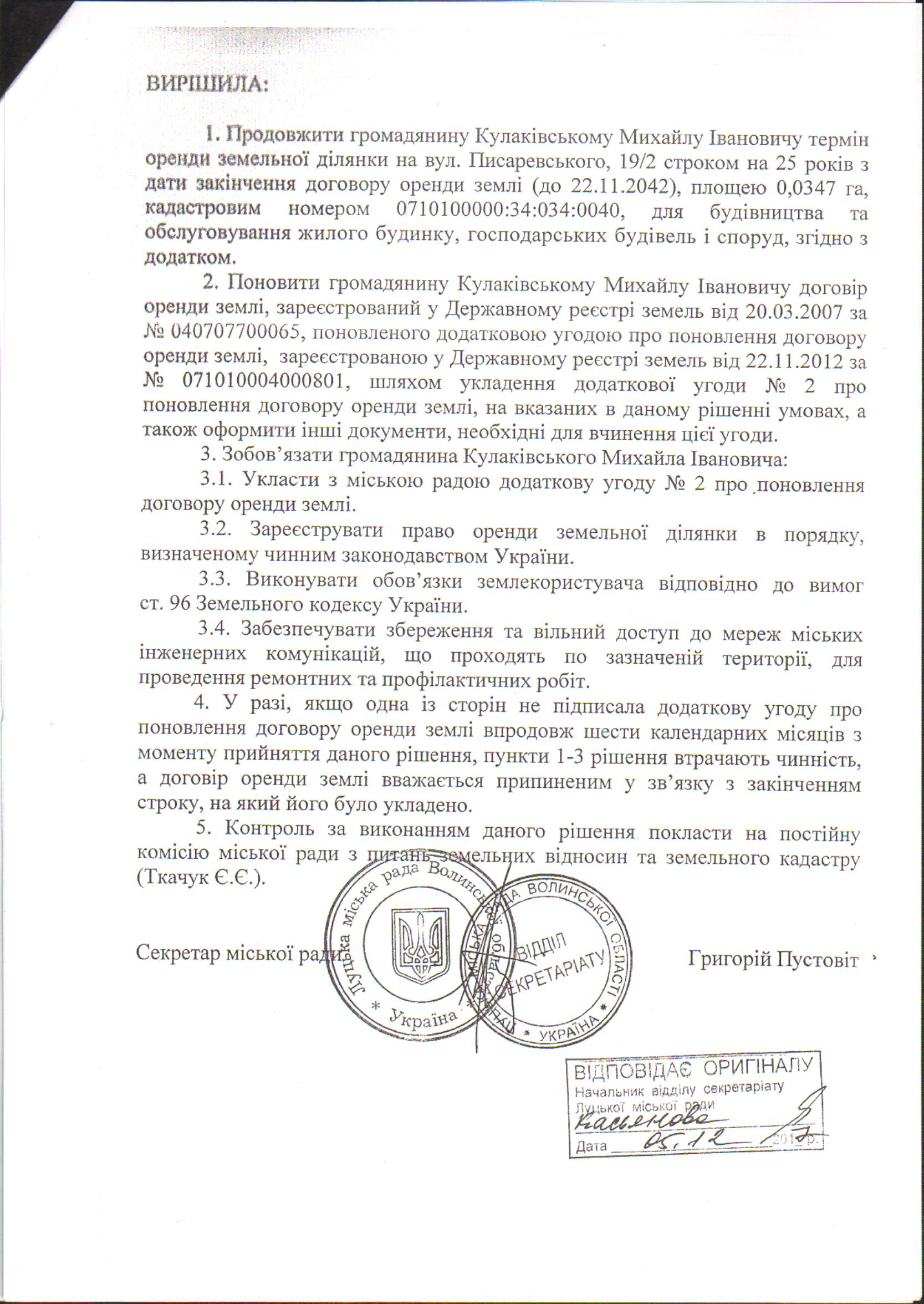 1. Рішення Луцької міської ради від 04.12.2017 № 34/70 “Про поновлення договору оренди землі громадянину Кулаківському М.І. для будівництва та обслуговування жилого будинку, господарських будівель і споруд на вул. Писаревського, 19/2” втратило чинність у зв’язку із неукладенням додаткової угоди № 2 про поновлення договору оренди оренди землі.