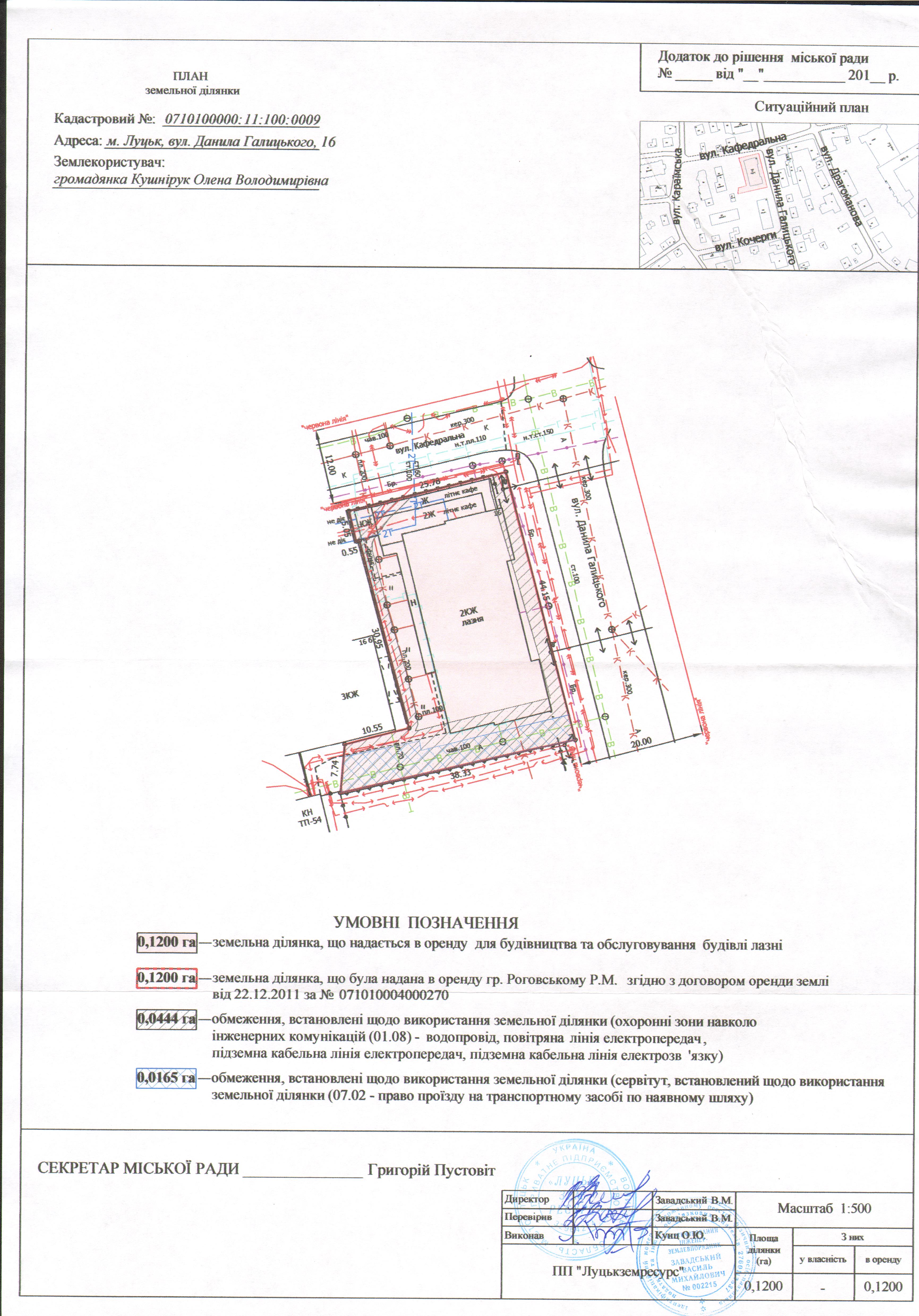 2. Надати громадянці Кушнірук Олені Володимирівні земельну ділянку на вул. Данила Галицького, 16, на умовах оренди строком на 10 років з дати укладення договору оренди землі, площею 0,1200 га, кадастровим номером 0710100000:11:100:0009, для будівництва та обслуговування будівлі лазні, згідно з додатком.