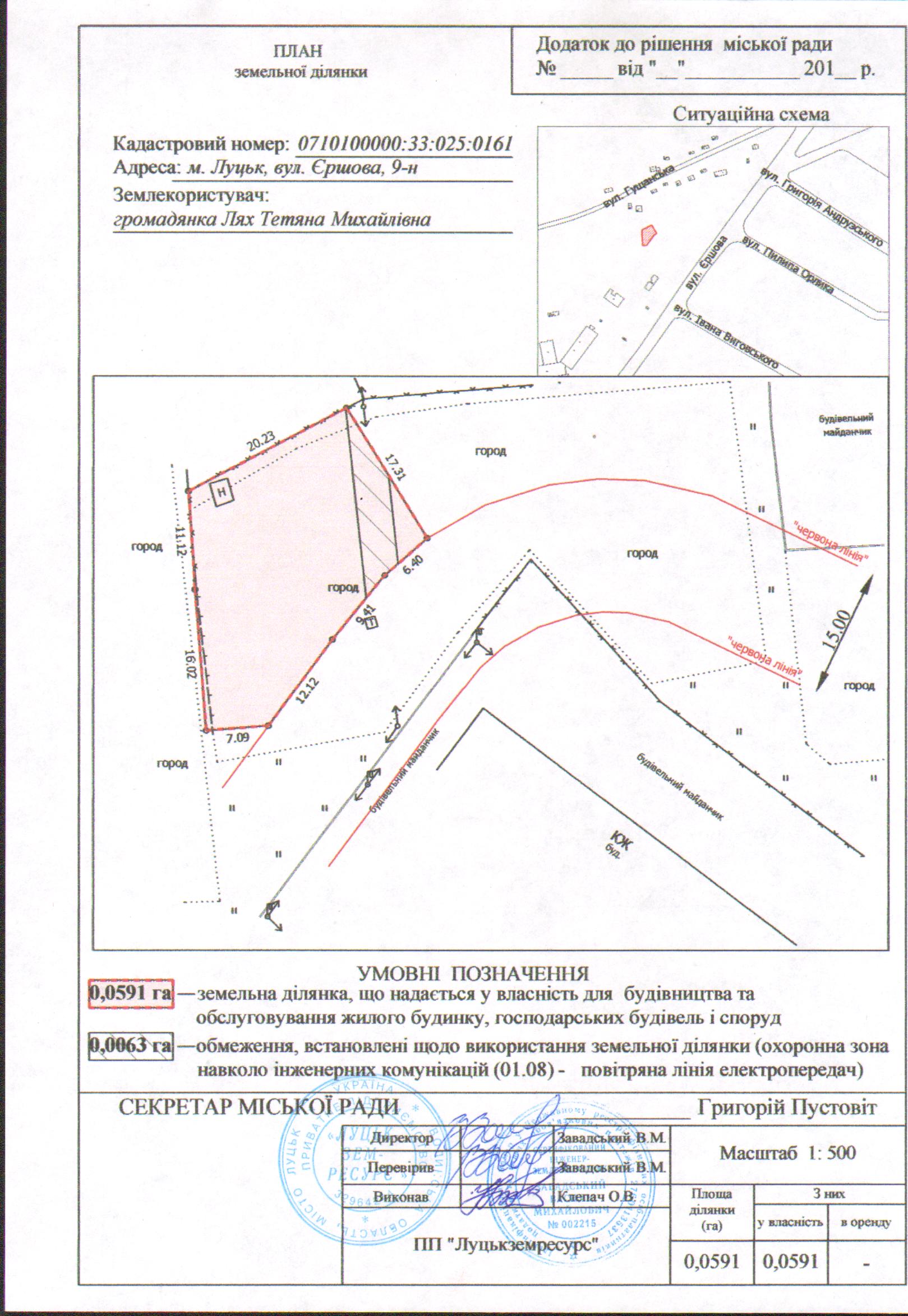 2. Надати громадянці Лях Тетяні Михайлівні у власність земельну ділянку на вул. Єршова, 9-н площею 0,0591 га, кадастровим номером 0710100000:33:025:0161 для будівництва та обслуговування жилого будинку, господарських будівель і споруд, згідно з додатком.