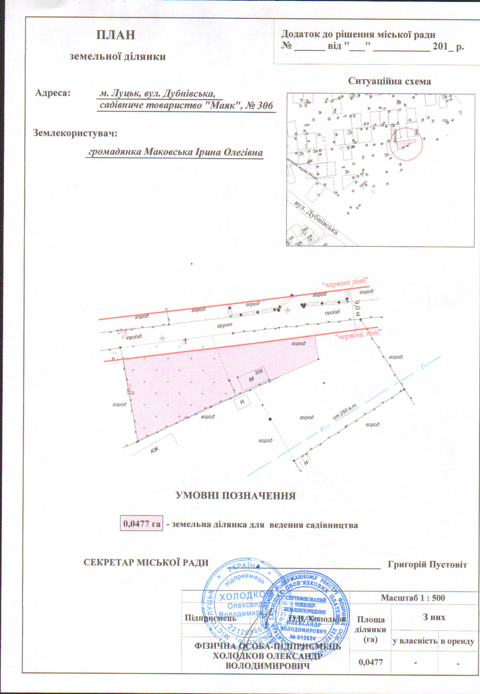 Розглянувши заяву громадянки Маковської Ірини Олегівни про надання дозволу на розроблення технічної документації із землеустрою щодо встановлення (відновлення) меж земельної ділянки в натурі (на місцевості) на вул. Дубнівській в садівничому товаристві «Маяк» №306, довідку із садівничого товариства «Маяк», керуючись статтями 12, 96, 116, 118, 120, 121 Земельного кодексу України, Законом України «Про внесення змін до деяких законодавчих актів України щодо розмежування земель державної та комунальної власності», Законом України «Про землеустрій», Законом України «Про Державний земельний кадастр», Постановою Кабінету Міністрів України від 17.10.2012р. №1051 «Про затвердження Порядку ведення Державного земельного кадастру», ст. 26 Закону України «Про місцеве самоврядування в Україні» Генеральним планом міста Луцька, затвердженим рішенням міської ради від 24.06.2009 №42/1 «Про затвердження Генерального плану міста», планом зонування міста Луцька, затвердженим рішенням міської ради від 31.03.2015 №71/13 «Про затвердження плану зонування території міста Луцька», міська рада