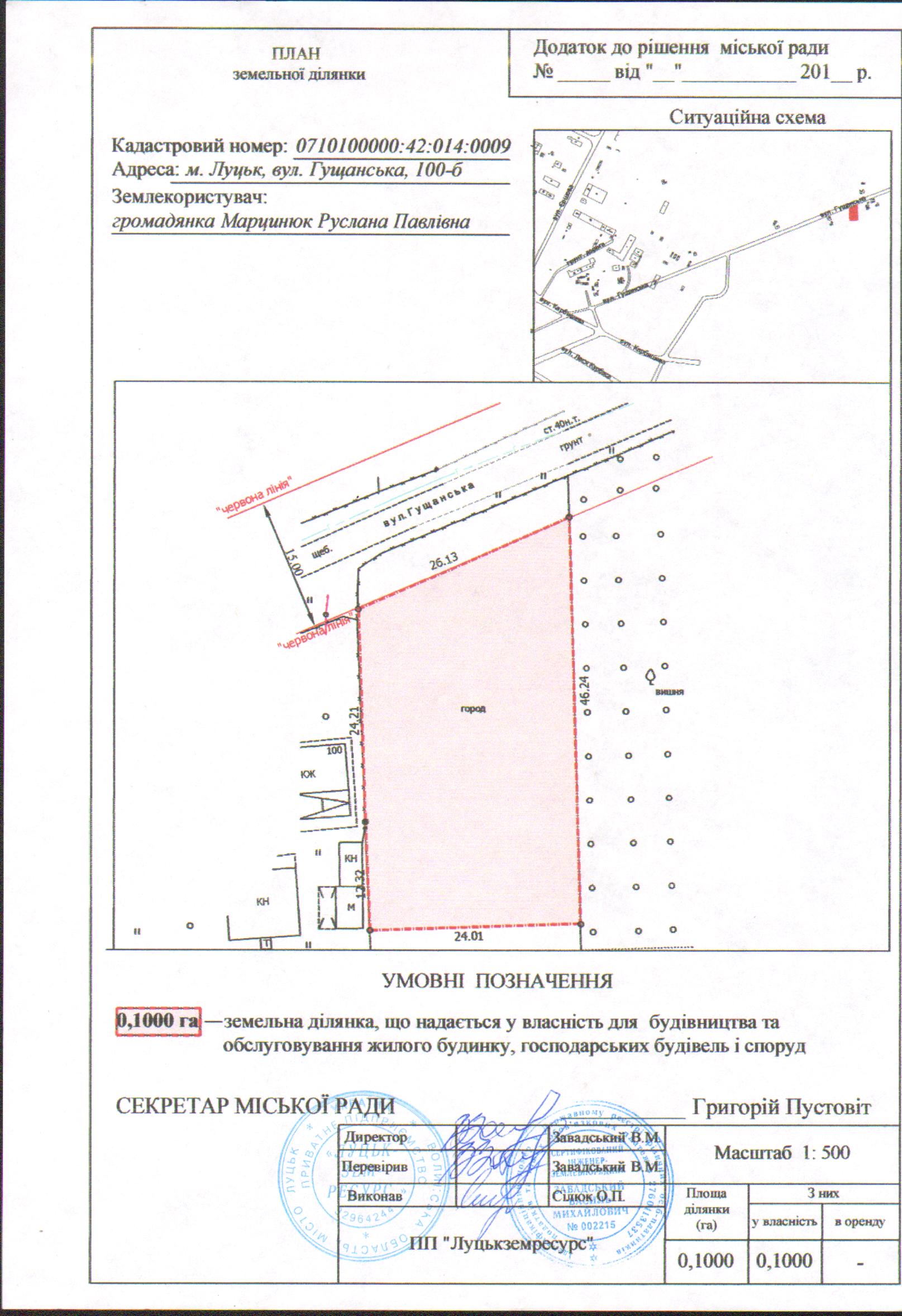 1. Затвердити громадянці Марцинюк Руслані Павлівні проект землеустрою щодо відведення земельної ділянки на вул. Гущанській, 100-б площею 0,1000 га, кадастровим номером 0710100000:42:014:0009 для будівництва та обслуговування жилого будинку, господарських будівель і споруд.