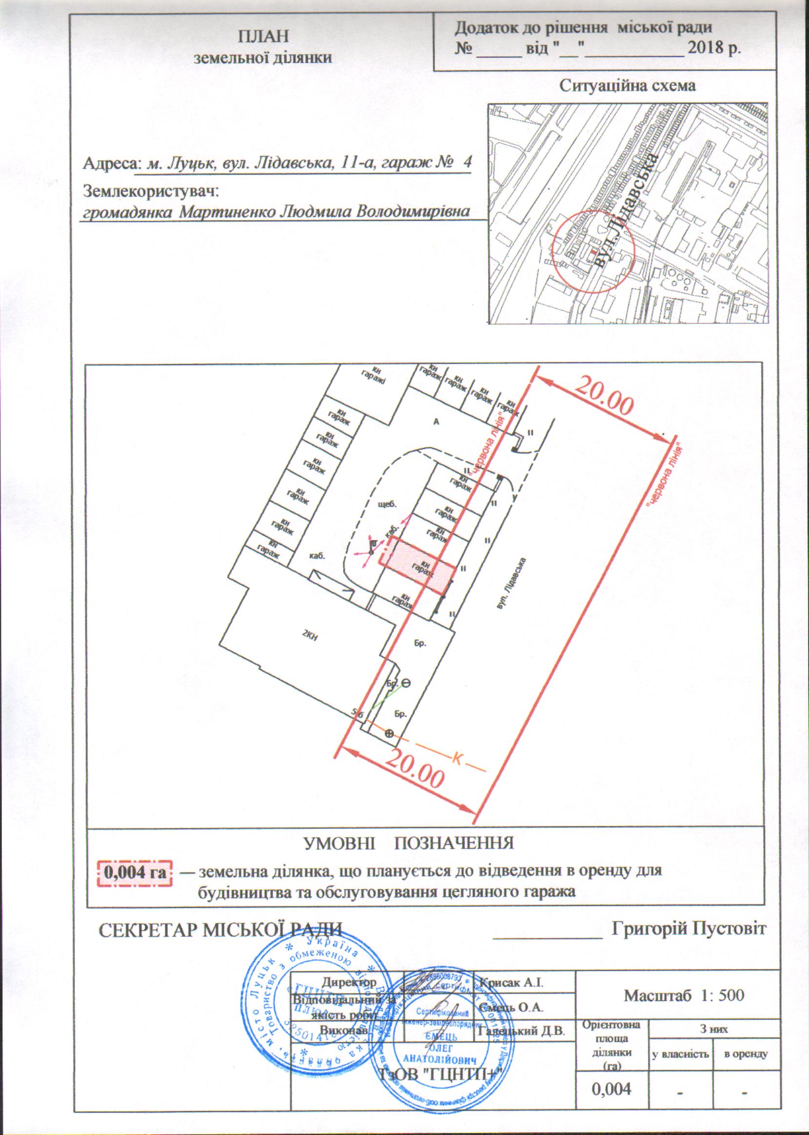 1. Надати громадянці Мартиненко Людмилі Володимирівні дозвіл на розроблення проекту землеустрою щодо відведення земельної ділянки на умовах оренди для будівництва та обслуговування цегляного гаража на вул. Лідавській, 11-а, гараж № 4, орієнтовною площею 0,004 га, з земель комунальної власності, згідно з додатком.