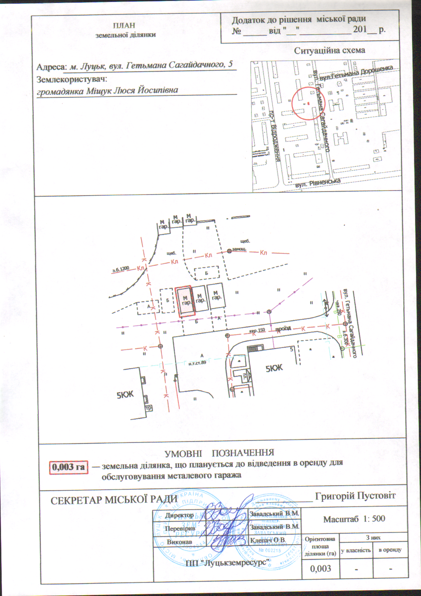 1. Надати громадянці Міщук Люсі Йосипівні надати дозвіл на розроблення проекту землеустрою щодо відведення земельної ділянки на умовах оренди для обслуговування металевого гаража на вул. Гетьмана Сагайдачного, 5 орієнтовною площею 0,003 га, з земель комунальної власності, згідно з додатком.