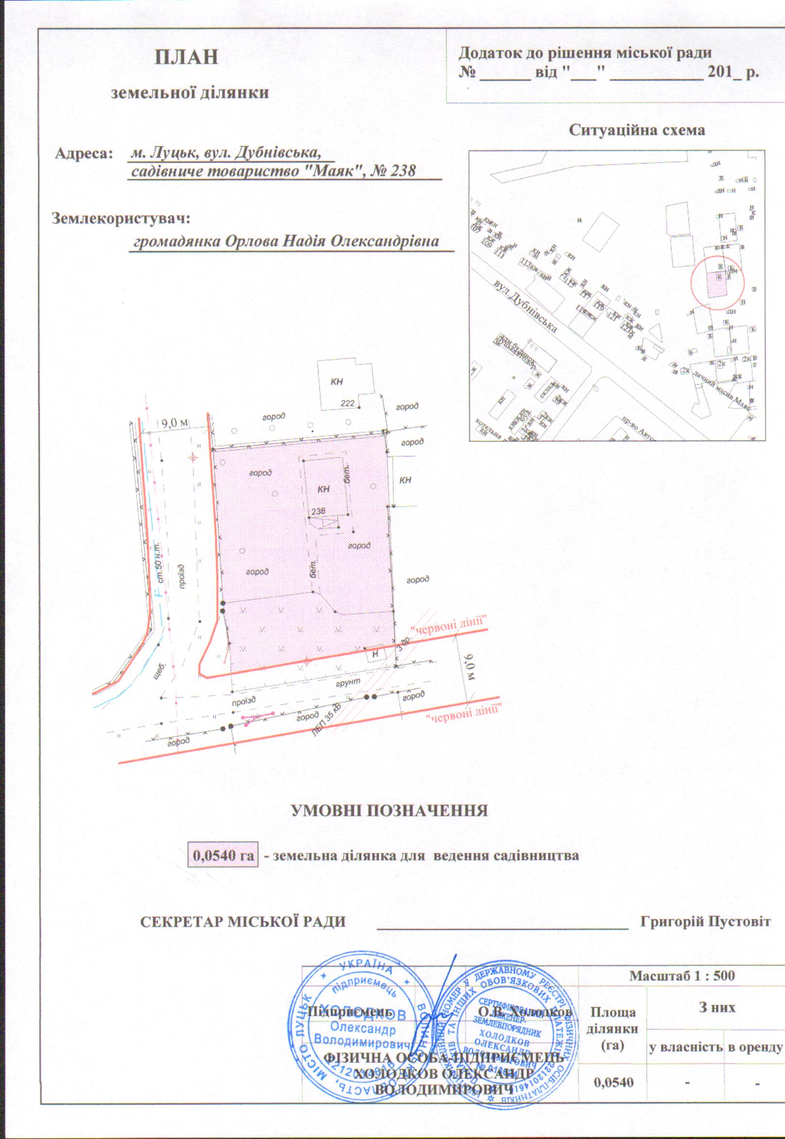 1. Надати громадянці Орловій Надії Олександрівні дозвіл на розроблення технічної документації із землеустрою щодо встановлення (відновлення) меж земельної ділянки в натурі (на місцевості) на вул. Дубнівській в садівничому товаристві «Маяк» №238, згідно з додатком.