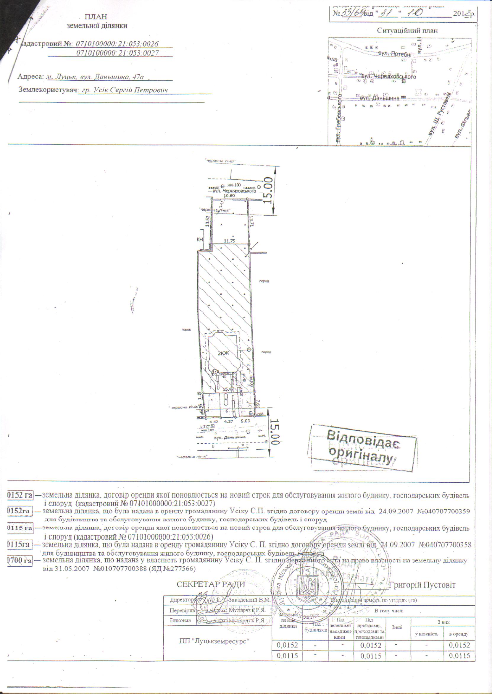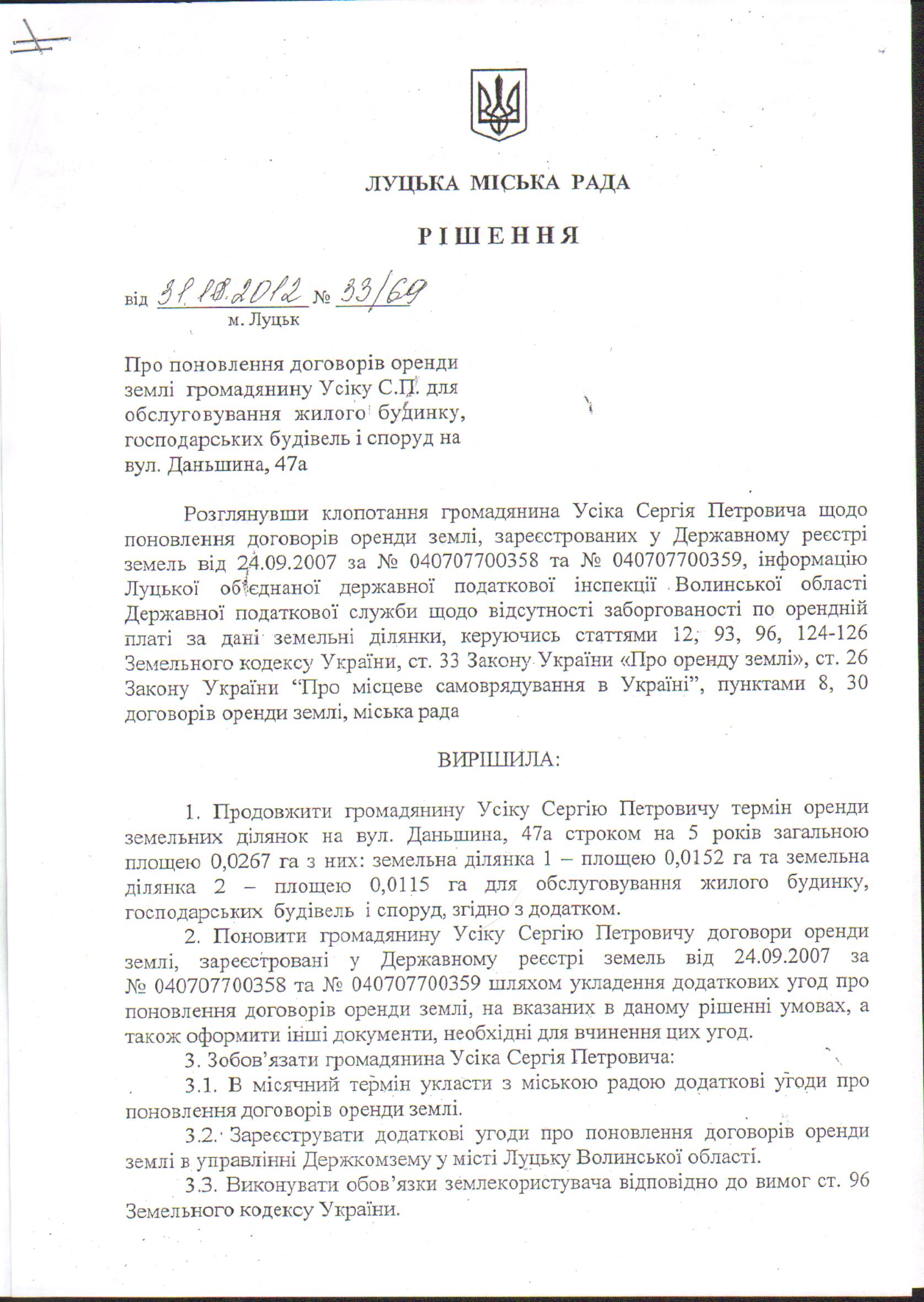 6. Рішення Луцької міської ради від 31.10.2012 № 33/69 «Про поновлення договорів оренди землі громадянину Усіку С.П. для обслуговування жилого будинку, господарських будівель і споруд на вул. Даньшина, 47а» втратило чинність у зв’язку із неукладенням додаткових угод про поновлення договорів оренди землі.