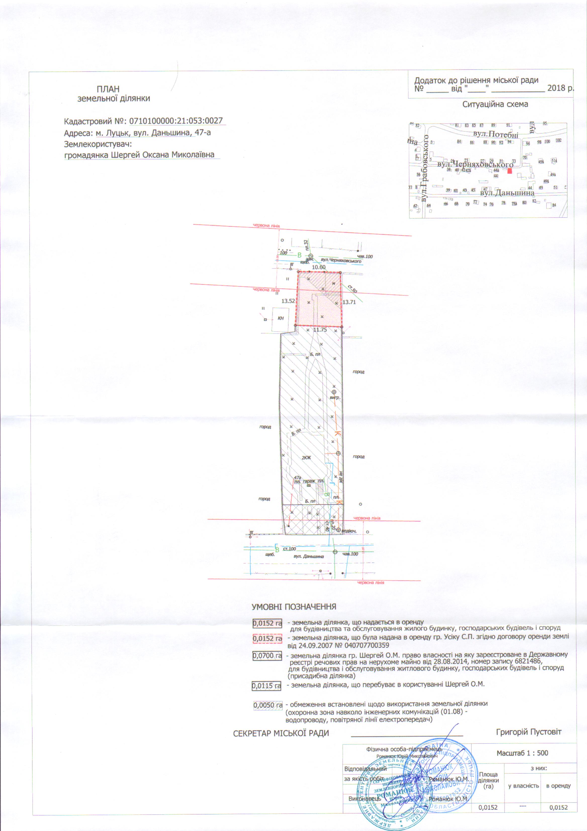 2. Надати громадянці Шергей Оксані Миколаївні земельну ділянку на вул. Даньшина, 47-а, на умовах оренди строком на 25 років з дати укладення договору оренди землі, площею 0,0152 га, кадастровим номером 0710100000:21:053:0027, для будівництва та обслуговування жилого будинку, господарських будівель і споруд, з земель комунальної власності, згідно з додатком.